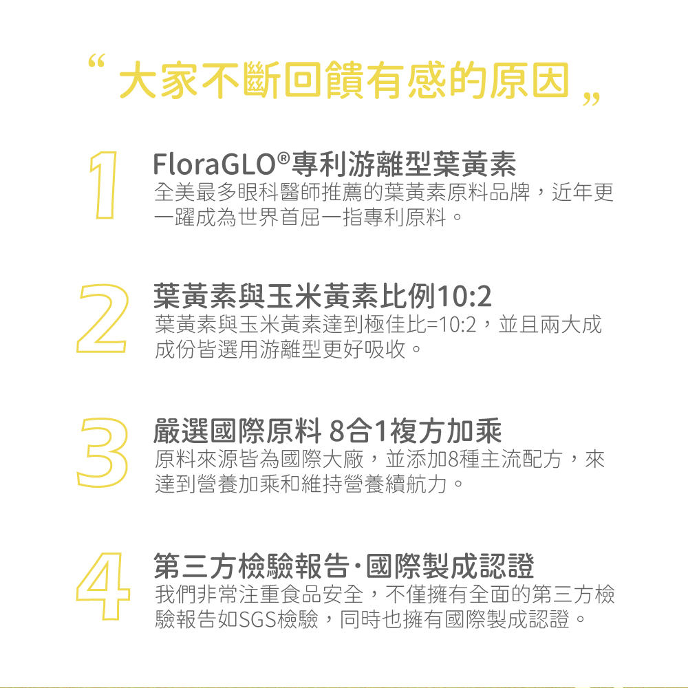 成 分:松樹皮萃取、金盞花萃取物(含游離型葉黃素)、魚油魚油(含DHA)、紅藻萃取物(含蝦紅素)、金盞花萃取物(含游離型玉米黃素)、綜合維生素礦物質