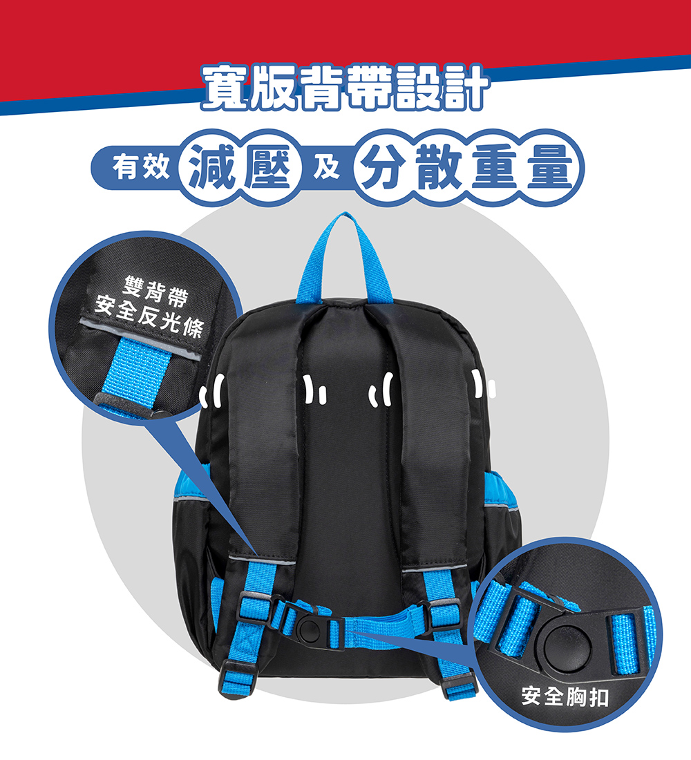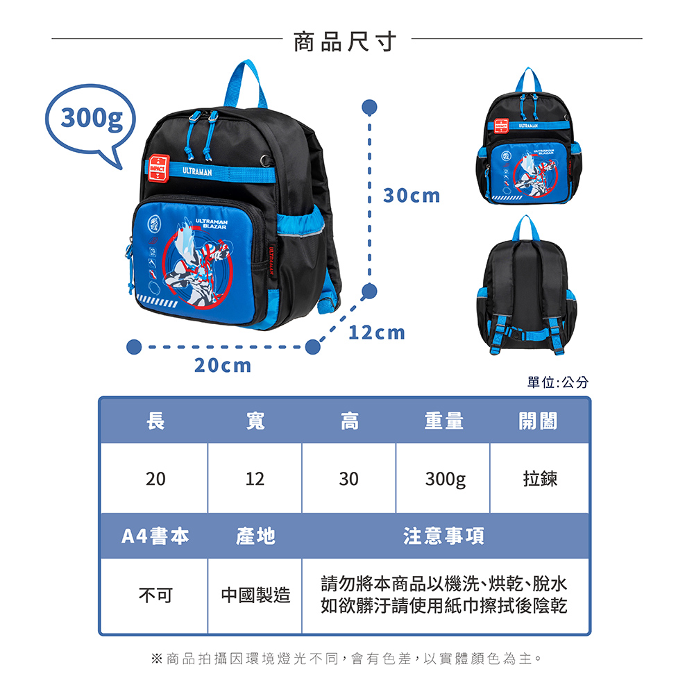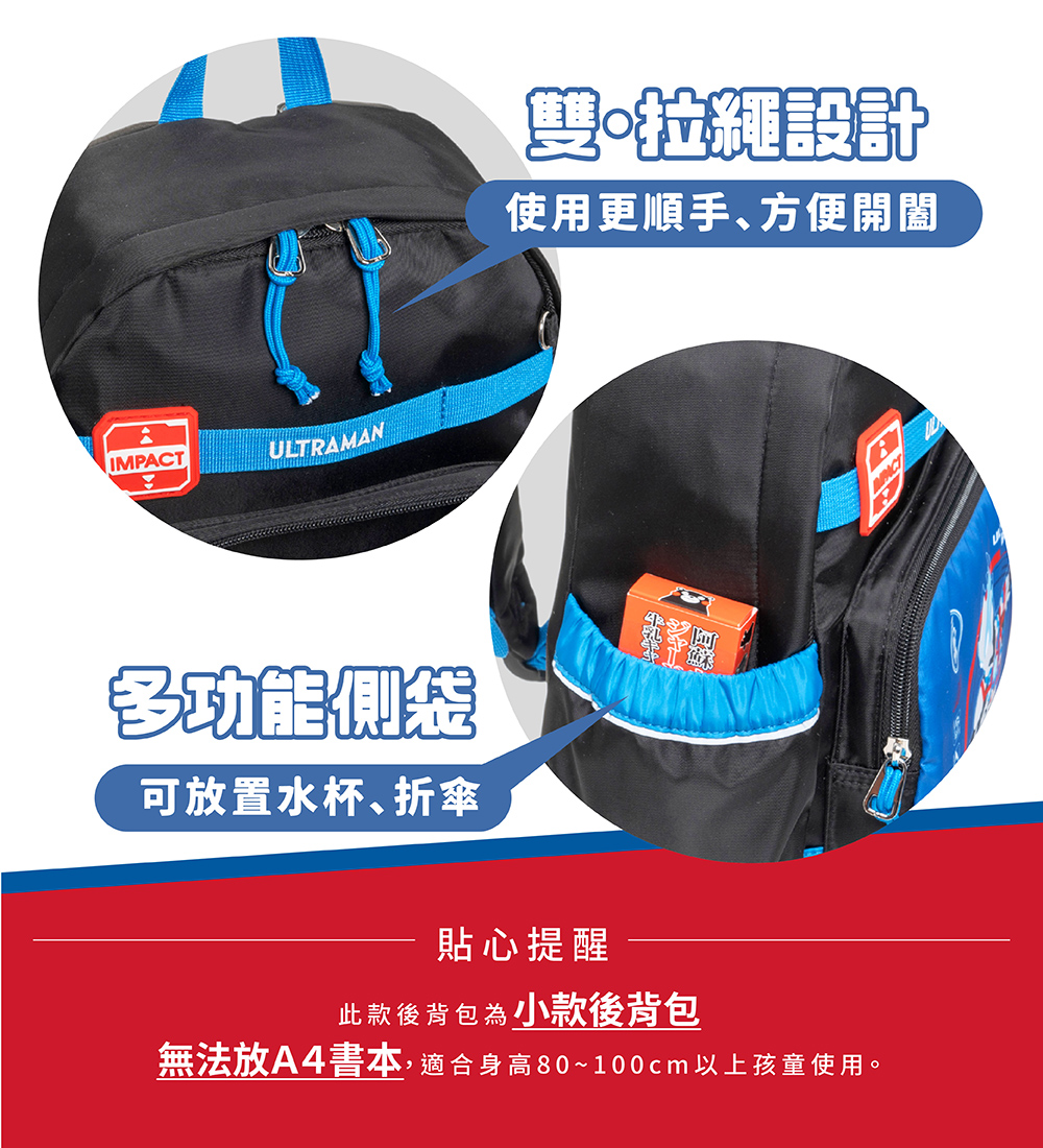 商品特色超人力霸王圖樣細緻印刷,實現男孩心中的超人夢想不可裝A4書本,兩側置物袋可放雨傘及水壺安全胸扣帶設計,增加行進穩定性可調式背帶設計,長度可彈性調整紅色微量射出立體LOGO標設計,豐富視覺層次