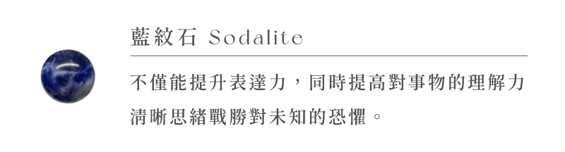 【水晶】◦ 藍紋石 | 提升洞察力, 實踐力, 理性思考◦ 黃塔晶 | 招財, 生意緣, 助事業◦ 黃水晶 | 招財, 偏財運, 助事業◦ 藍紋瑪瑙 | 療癒內心, 消除疲勞◦ 白瑪瑙 | 辟邪, 舒緩壓力, 增加免疫力