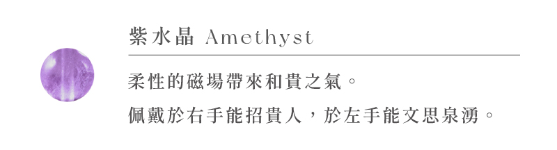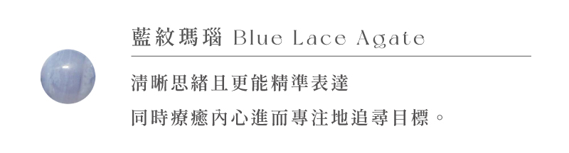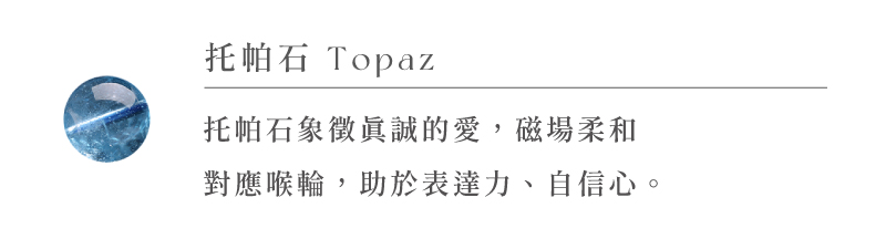 【水晶】◦ 托帕石 | 提升自信, 舒緩壓力◦ 紫水晶 | 增智慧, 招財, 招貴人◦ 海藍寶 | 思緒清晰, 提升自信, 溝通表達◦ 白石英 | 專注力, 消除負能量◦ 藍紋瑪瑙 | 療癒內心, 消除疲勞