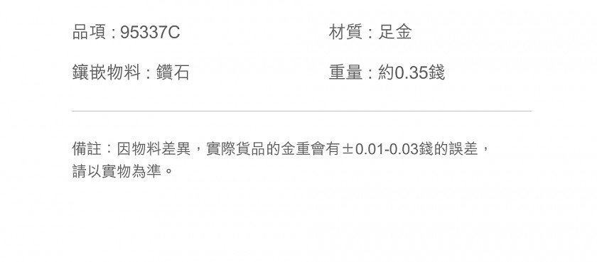 【商家資訊】公司名:英屬維爾京群島商周生生珠寶行股份有限公司台灣分公司統一編號:89390142客服電話:02-2789-6809客服時段:週一~週五10:00~17:00