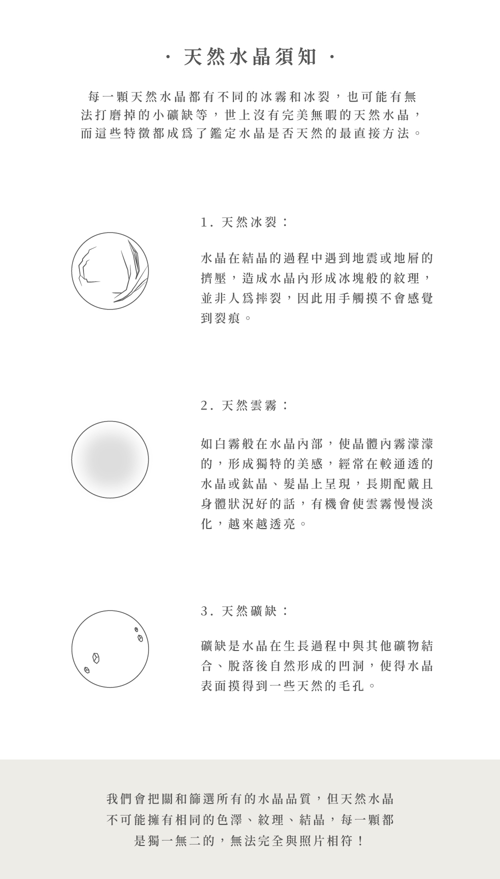 ①採用天然水晶,晶體內部有冰裂、棉絮、礦缺等現象,皆為天然水晶的獨有特色,並非瑕疵。②商品為天然材質,同種水晶顏色會有深淺差異,請以實際收到的商品顏色為主。