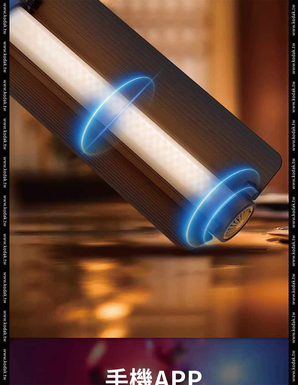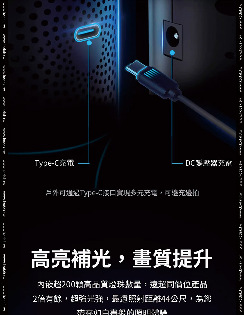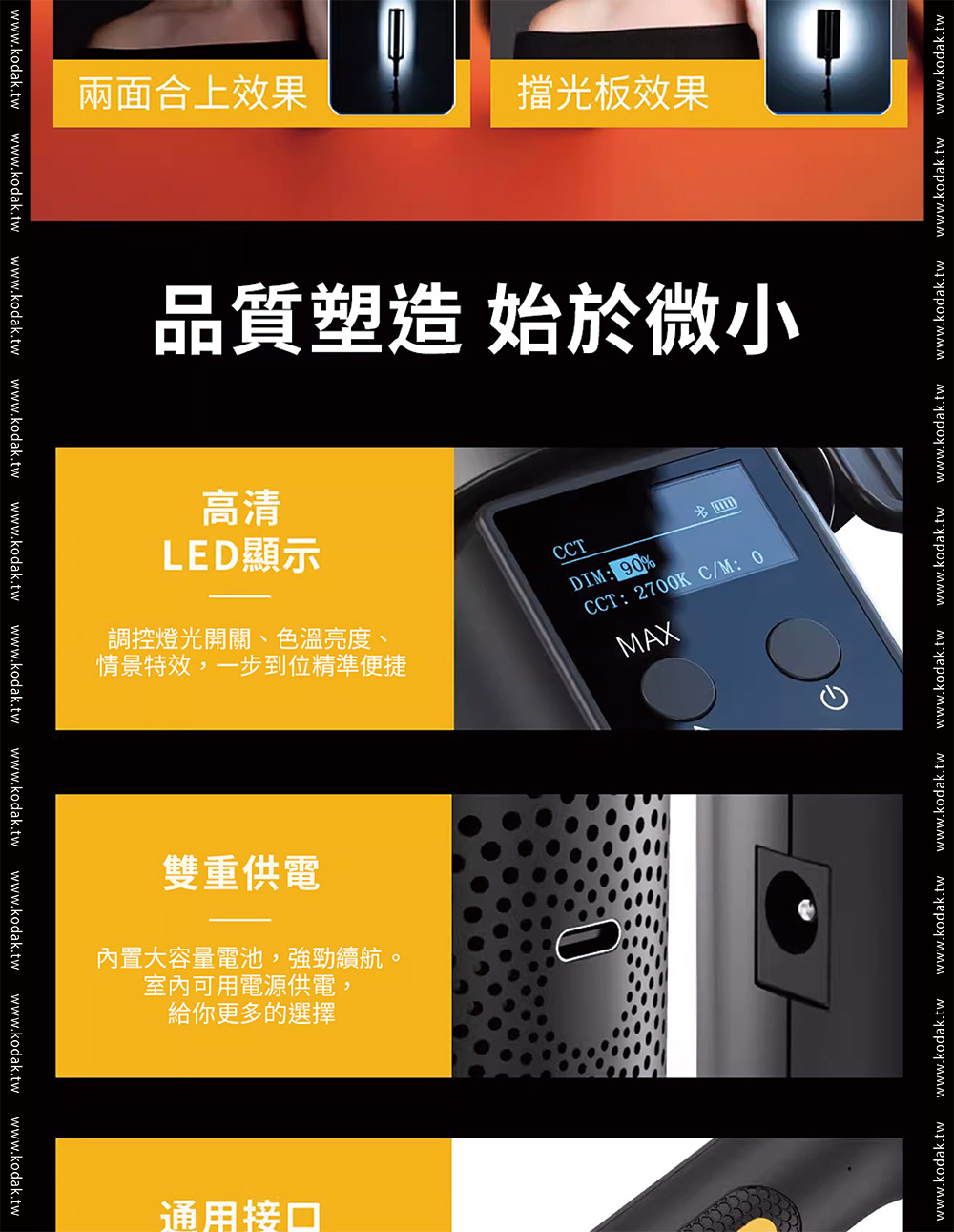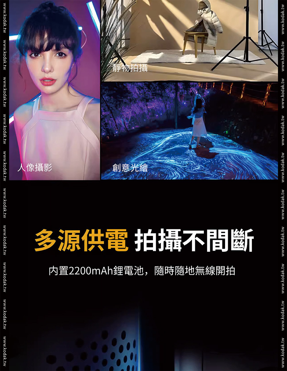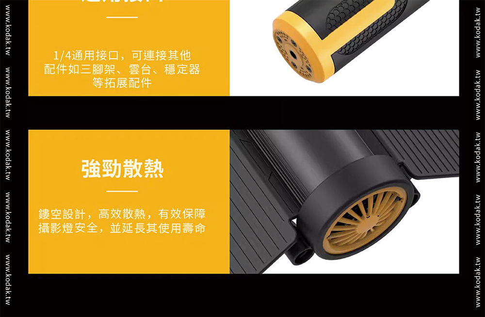 品牌Kodak柯達產品型號 LS30產品功率 25W色溫調節 2700K-10000K 200KCRI(RA) 95色相 0-360°調光範圍 0%-100%飽和度 0%-100%紅綠補償 30%LED數量 120pcs冷燈、120pcs暖燈、60pcsRGB燈發光角度 120°產品特效 20種特效速度 9控制方式 燈體控制、手機APP控制藍芽控制距離 >60M電池 11.1V2200mAh 24.42Wh電池續航時間 100%亮度約72分鐘TypeC充電 支持QC3.05-9V,最大15W充電器 DC12.6V 2A尺寸 56*56*598mm(不含擋板)擴展 1/4通用螺孔