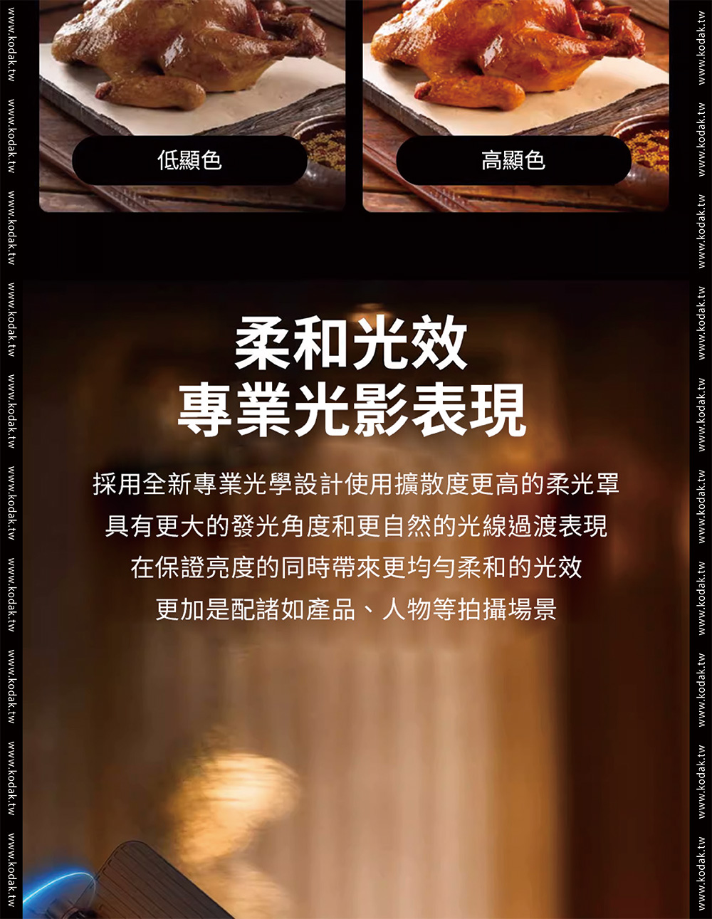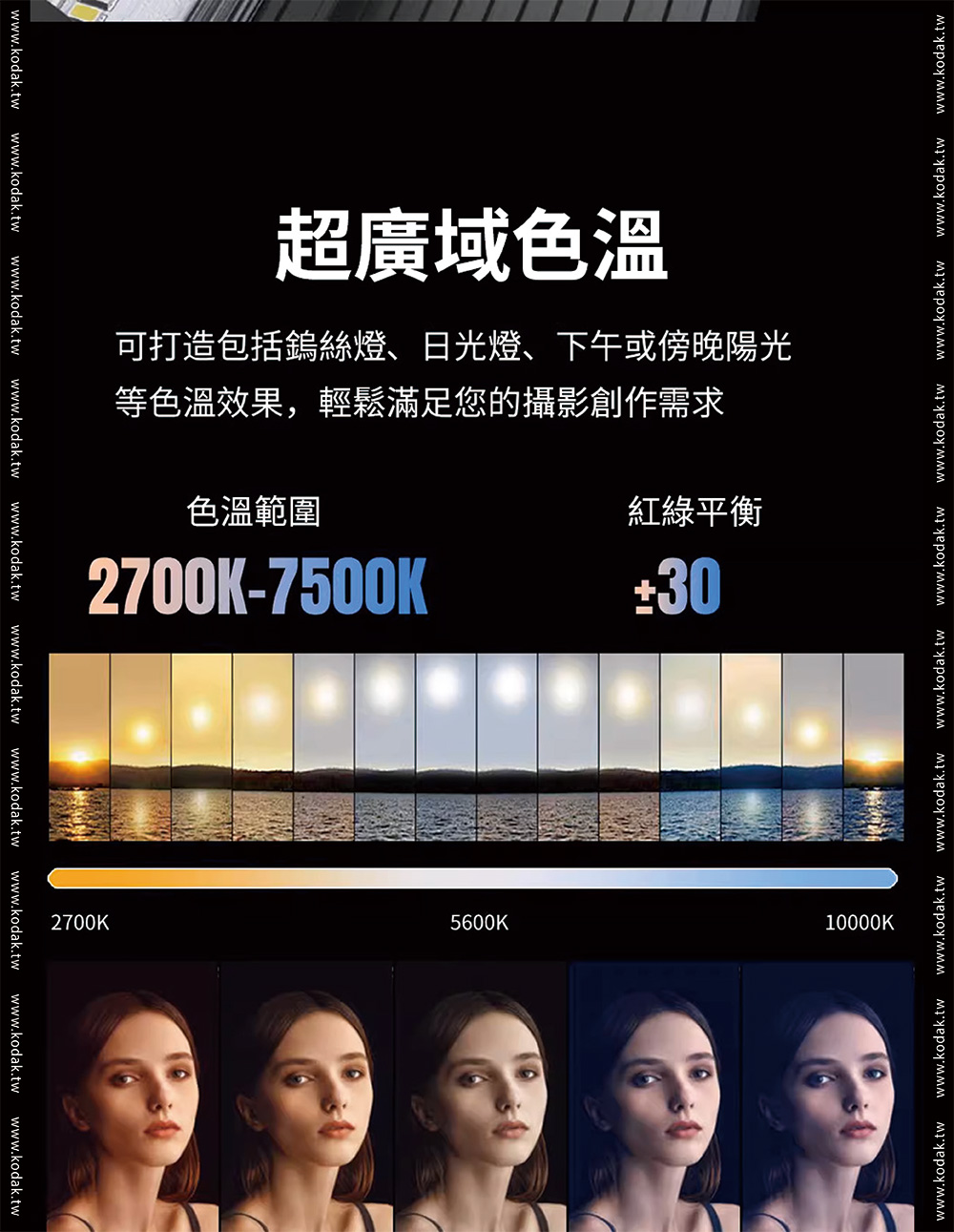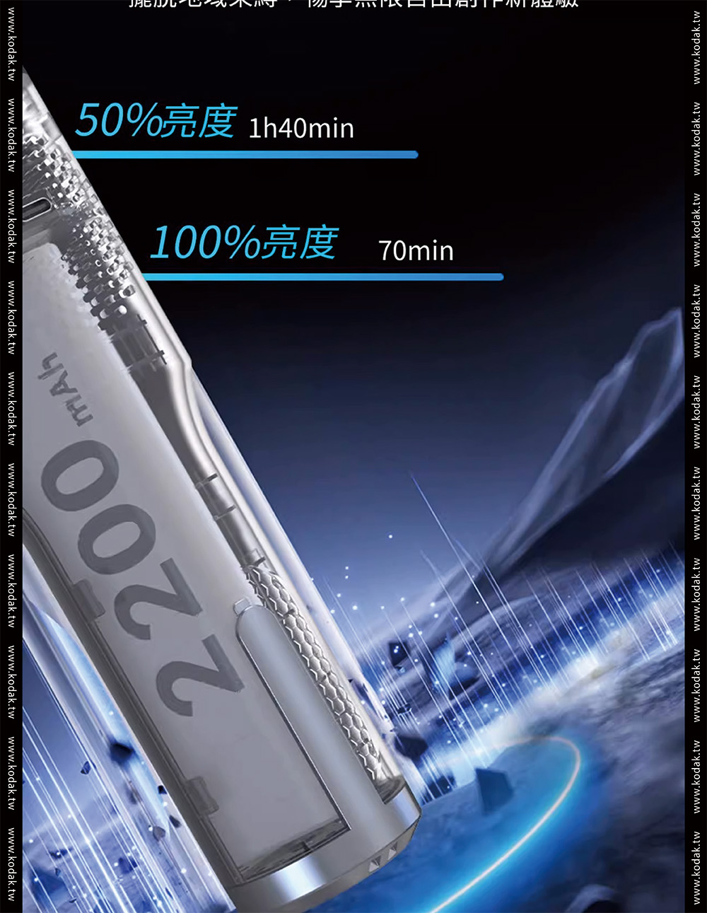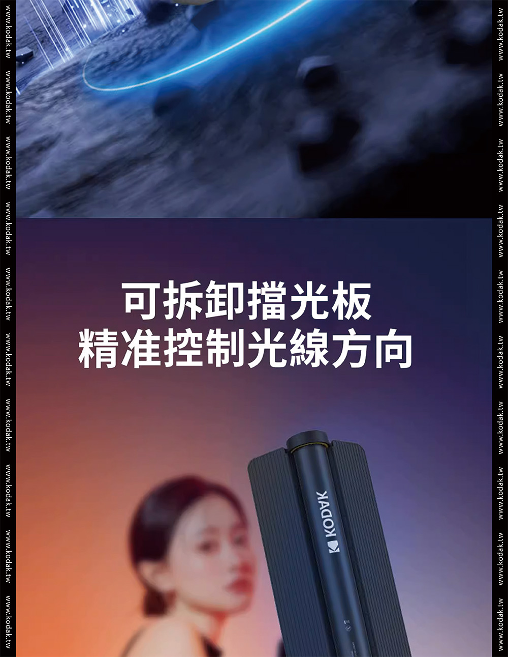 品牌Kodak柯達產品型號 LS30產品功率 25W色溫調節 2700K-10000K 200KCRI(RA) 95色相 0-360°調光範圍 0%-100%飽和度 0%-100%紅綠補償 30%LED數量 120pcs冷燈、120pcs暖燈、60pcsRGB燈發光角度 120°產品特效 20種特效速度 9控制方式 燈體控制、手機APP控制藍芽控制距離 >60M電池 11.1V2200mAh 24.42Wh電池續航時間 100%亮度約72分鐘TypeC充電 支持QC3.05-9V,最大15W充電器 DC12.6V 2A尺寸 56*56*598mm(不含擋板)擴展 1/4通用螺孔