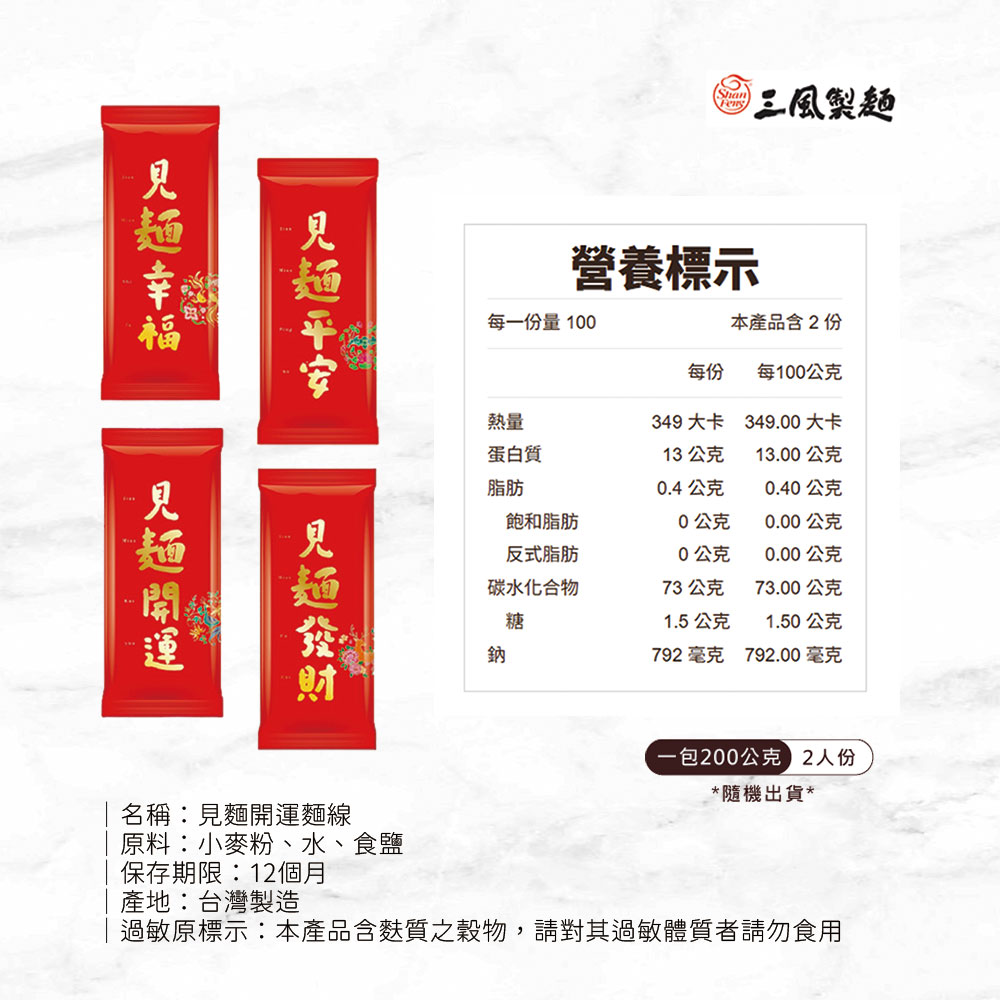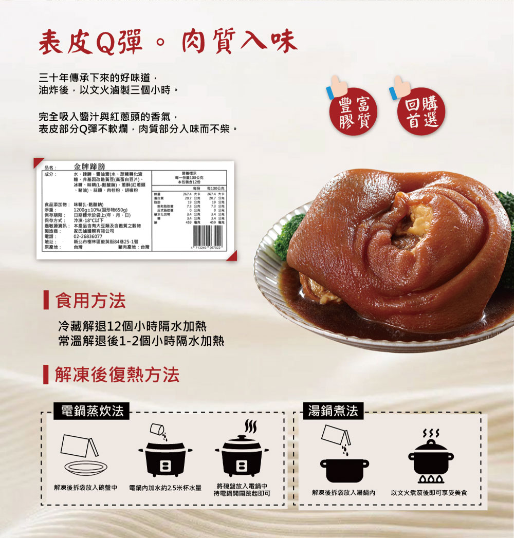 1.商品組合/規格:【家氏滷】金牌蹄膀(1200g)+麵線(200g)2.商品品名:【家氏滷】金牌蹄膀(1200g)+麵線(200g)3.商品重(容)量:金牌蹄膀1200g(固形物600g)+三風製麵 見麵系列麵線(200g/包)4.內容物成分:蹄膀、醬油膏(水、蔗糖轉化液糖、非基因改造黃豆(高蛋白豆片)、冰糖、味精(L-麩酸鈉)、蔥酥(紅蔥頭、豬油)、蒜頭、肉桂粉、胡椒;麵線(小麥粉.食鹽.水)※本產品含有大豆類及含麩質之穀物,生產廠房亦處理含麩質之穀物.芝麻.大豆.堅果.花生.牛奶.魚.蛋製品5.原產地(國):台灣※豬肉產地:台灣6.製造廠商或國內負責廠商名稱:一吉晟股份有限公司7.製造廠商或國內負責廠商地址:桃園市蘆竹區安中街20巷5號8.製造廠商或國內負責廠商電話:03-222-2258(代表號)9.保存期限:冷凍-18°C以下 180天(實際依包裝顯示)10.食品業者登錄字號:F-153188828-00000-611.投保產品責任險字號:明台產物第031OPDT00176