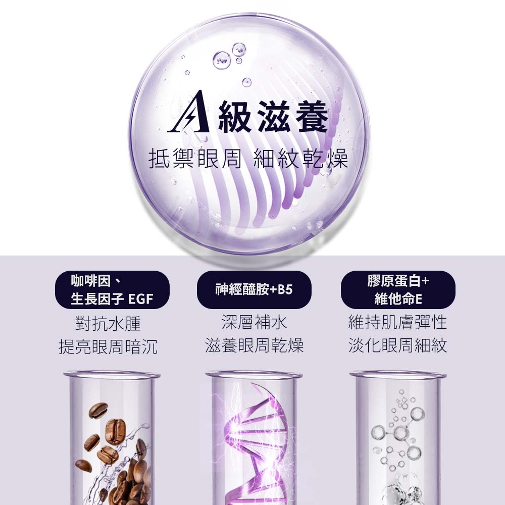 A醇撫紋眼霜-HPR、神經醯胺、B3、B5、咖啡因、金合歡醇、VITE、水解大米、大豆蛋白。