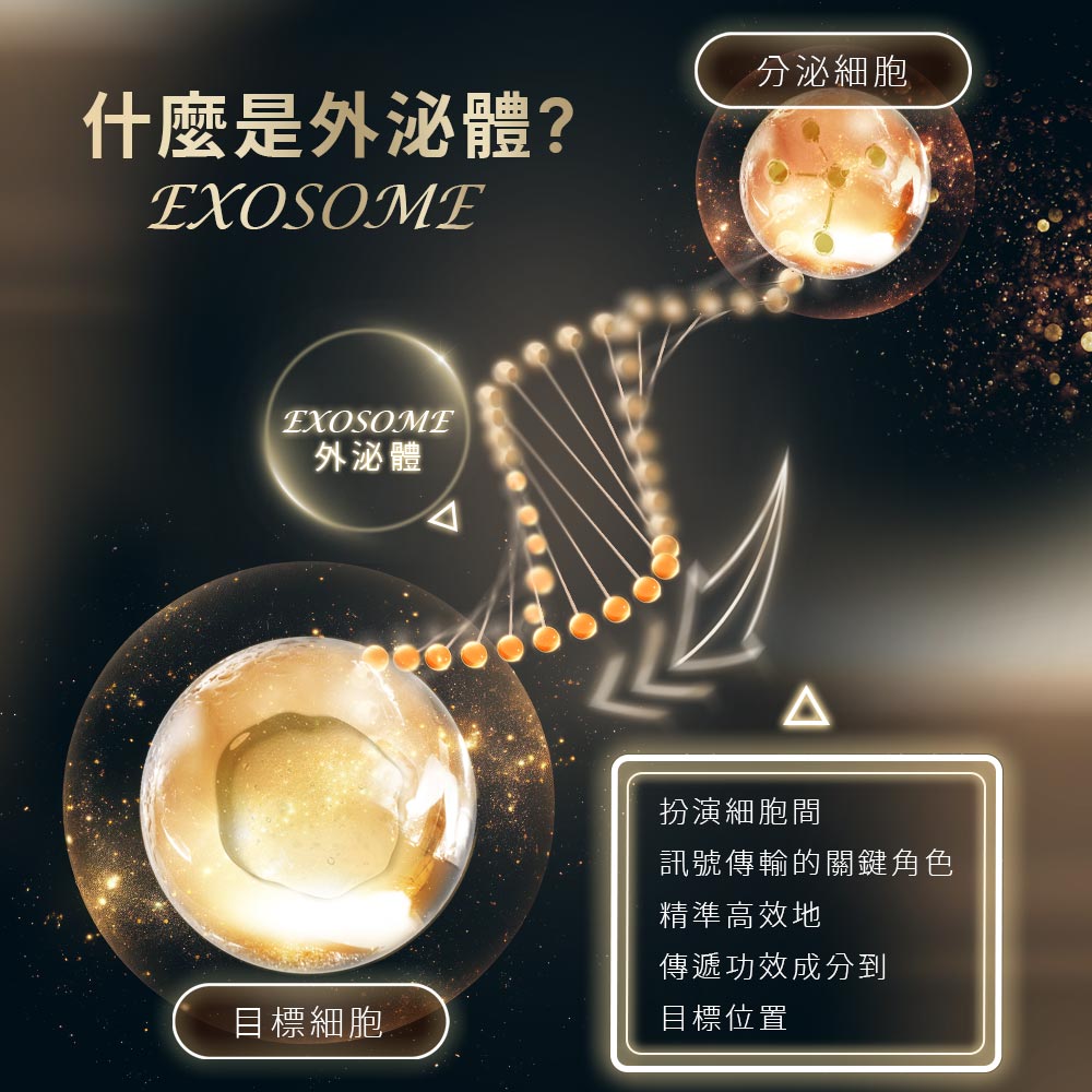 • 銷售重點o 雙重修護力量-PDRN(鮭魚DNA)與食藥署認可牛奶來源外泌體。o 深入肌底啟動修護機制,加速肌膚代謝更新,穩定膚況,亮白緊緻。o 啟動年輕能量-添加藍銅胜肽,淡化細紋與皺紋,提升肌膚彈性,讓膚質看起來更緊緻有彈力。o 鎖水力升級-含有高效保濕成分γ-PGA,具比玻尿酸更卓越的吸水力與鎖水能力。o 主要成分:牛奶外泌體、PDRN、藍銅胜肽、γ-PGA。o 使用方式:取適量精華液,輕輕按摩拍打至肌膚吸收,再進行後續保養。o 適用膚質:一般膚質,特別推薦老化、細紋、鬆弛等肌膚使用。