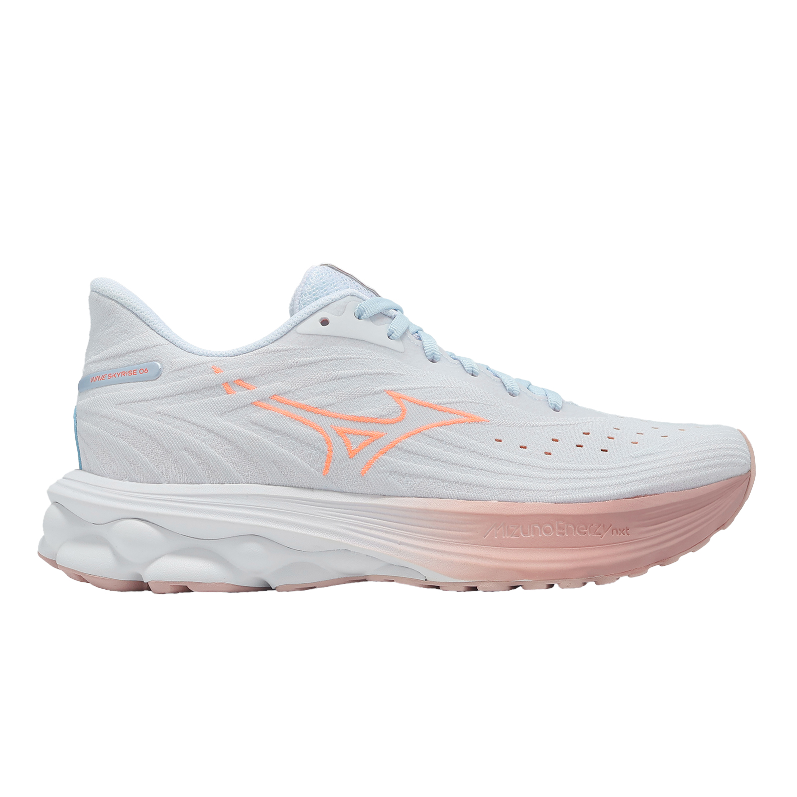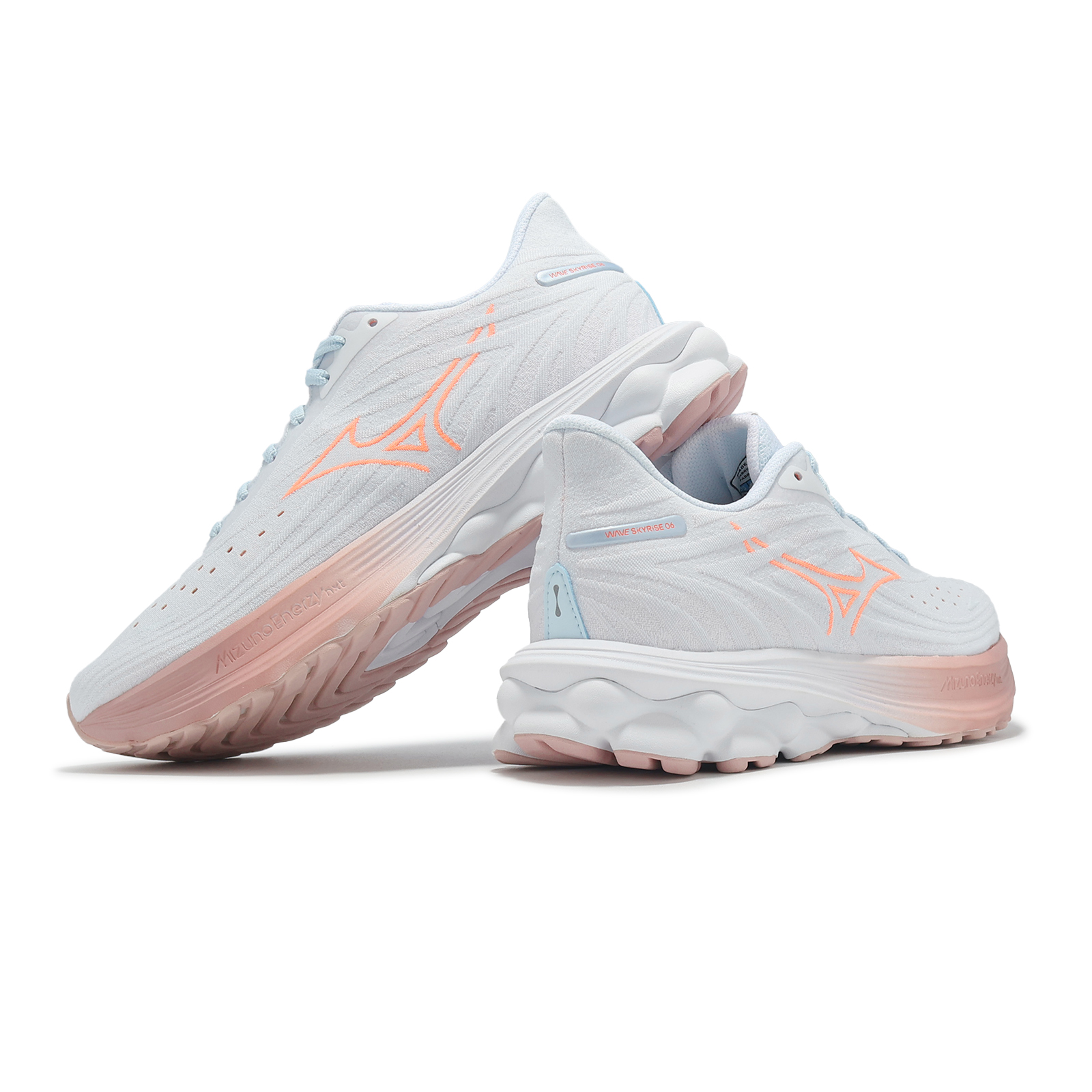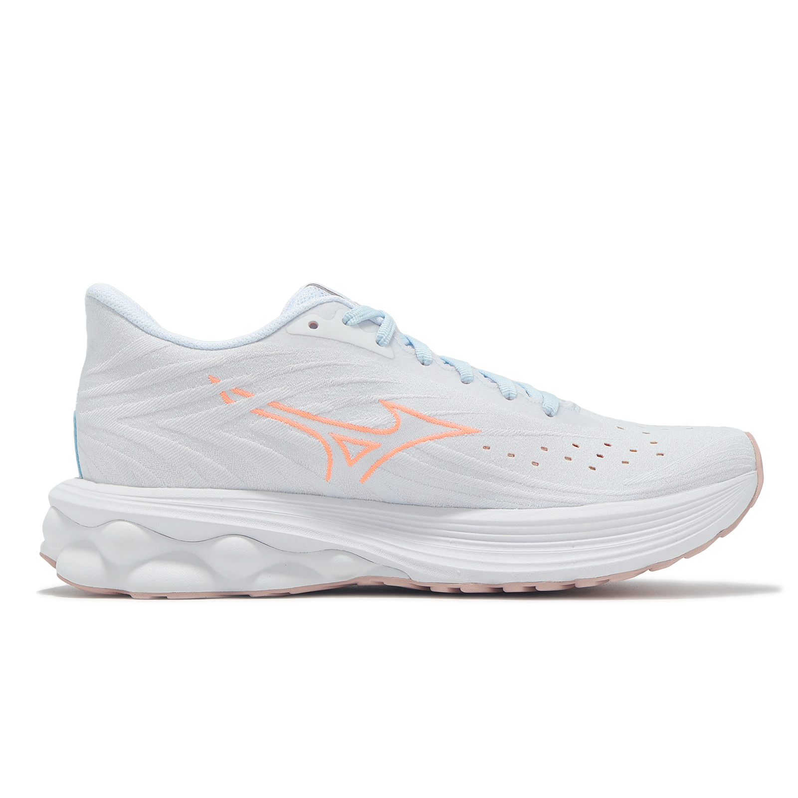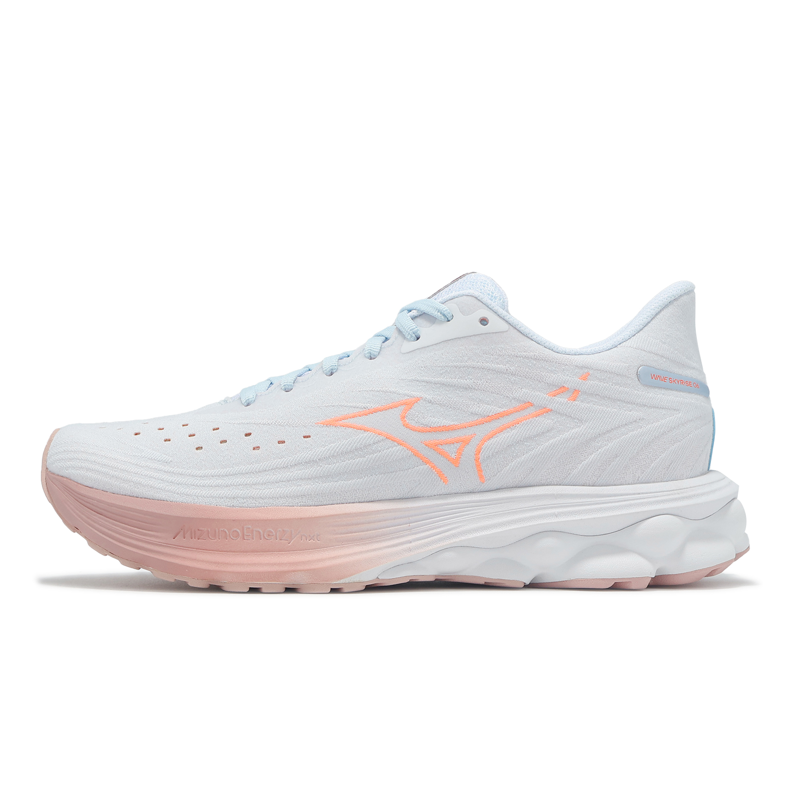 品牌: MIZUNO型號: J1GD2509-74品名: Wave Skyrise 6版型: 版型正常* 鞋面採用一片式 SMOOTH STRETCH WOVEN 平織網布構成,提供雙足穩定包覆感,鞋頭較前一代增加更多透氣孔,透氣效果提升。