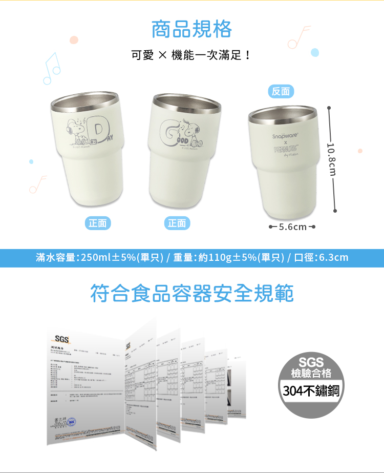 尺 寸:底徑5.6x高10.8cm(口徑6.3cm)滿水容量:250ml±5%(單只)重 量:約110g±5%(單只)材 質:杯身/(內)SUS304優質不鏽鋼 (外)高級不鏽鋼