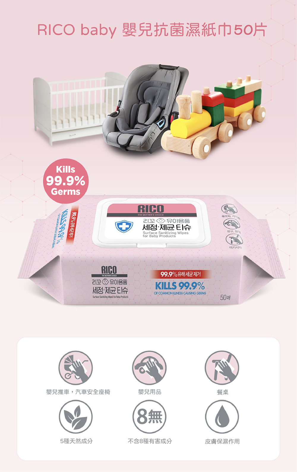 品號 5830030200020 品名 韓國 RICO baby 抗菌濕巾50抽-10入/箱【安琪兒婦嬰百貨】