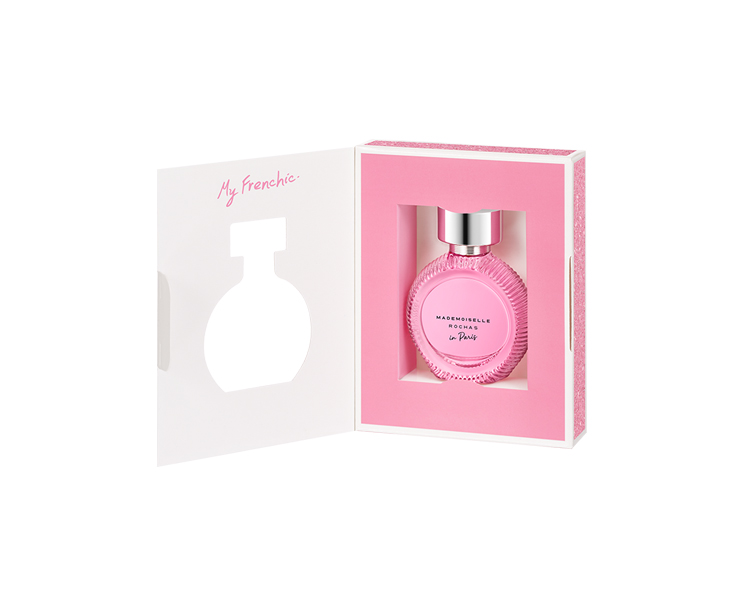 光之城、愛之城…巴黎有許多浪漫的別名,羅莎小姐在巴黎淡香精透過正面樂觀的玫瑰色鏡片看世界。帶有女性氣質的法式瓶身設計,簡約圓弧厚實粉紅色玻璃瓶身搭配條狀波紋,充滿活力的粉紅色就像是自在過著無憂無慮的生活。瓶身上裝飾著和香氛一樣閃亮耀眼的金蔥標籤,展現品牌大膽又時尚的一面。瓶口以ROCHAS代表性的白色緞帶點綴,帶來一抹法式優雅。外盒採用和瓶身呼應的粉色金蔥設計,就像是巴黎女孩活潑的個性一般亮眼。外盒白色與粉色對比展現現代法式風格,簡潔設計保留了優雅感,手寫字體的「in Paris」則是對巴黎與生活的愛的宣言。