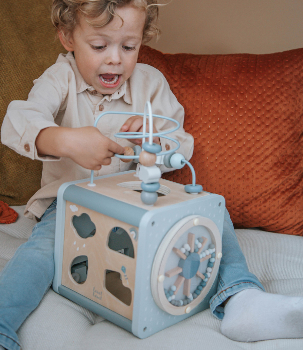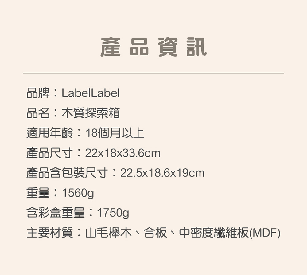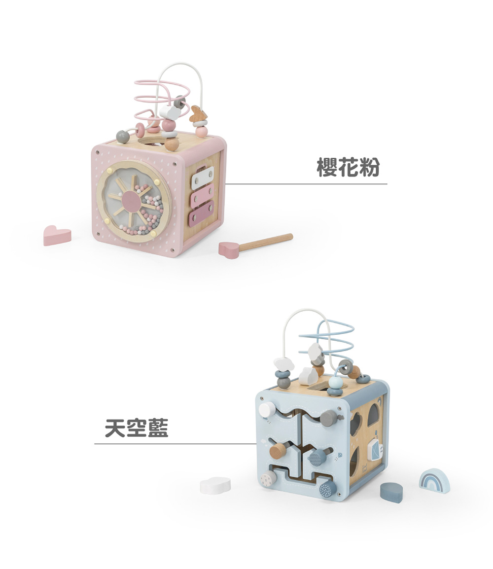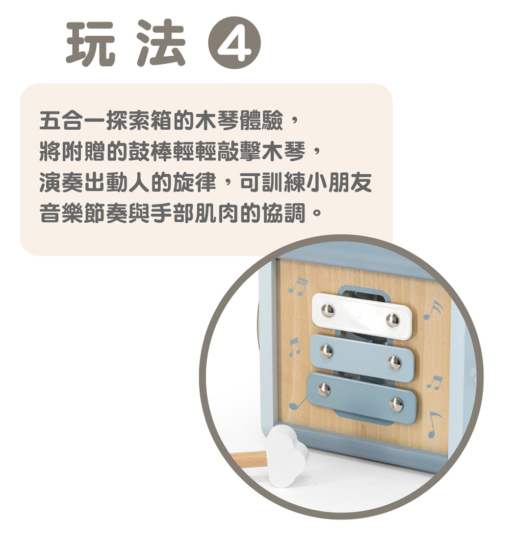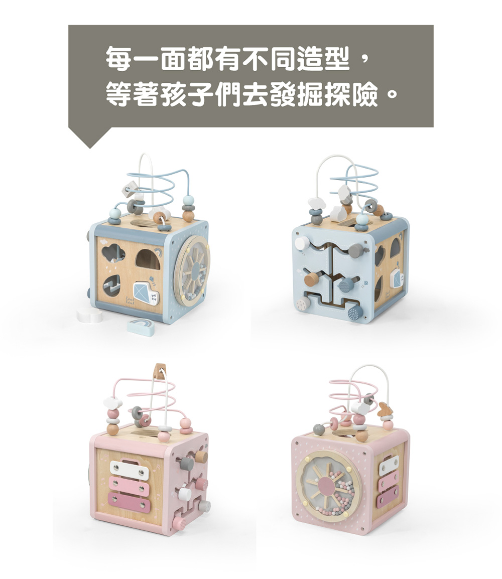 ● 每一面都有不同的驚喜,等著孩子們去發掘探險● 五合一探索箱有形狀分類器、齒輪、繞珠迷宮、木琴和珠子圓盤● 多種不同玩法,最上層的繞珠迷宮可拆式,好收納不占空間● 採用FSC™認證木質製成,外觀顏色使用兒童友善的水性顏料● 學習主題:眼部協調/手部小肌肉/形狀/顏色/配對