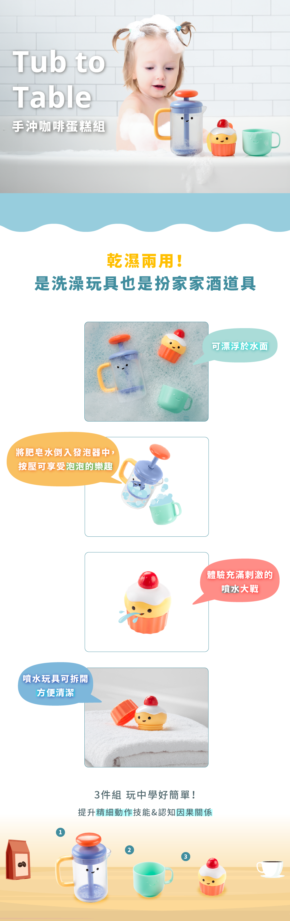 3件套組包含:發泡器、杯子、蛋糕噴水玩具