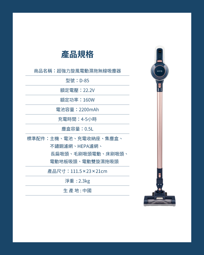 【HYD】超強力旋風電動濕拖無線吸塵器 D-85A(12件大全配組/乾濕吸塵器)