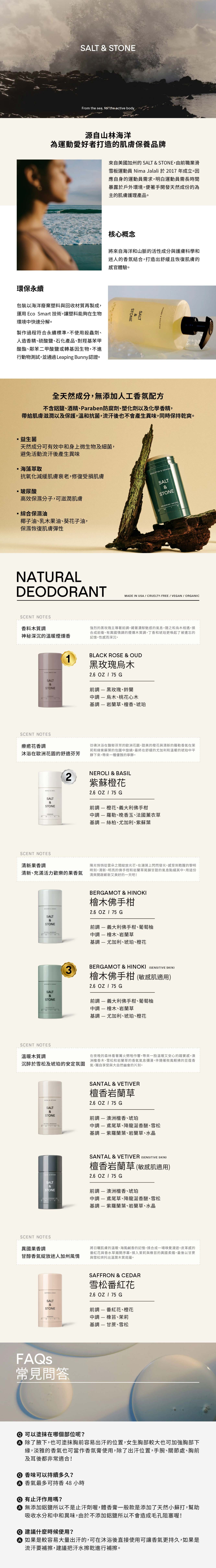 全天然成份,值得一提的是,SALT & STONE 體香膏全面不添加市面上止汗膏常見成分「鋁鹽」不避擔心毛囊阻塞而引起肌膚發炎問題,也不擔心致敏。