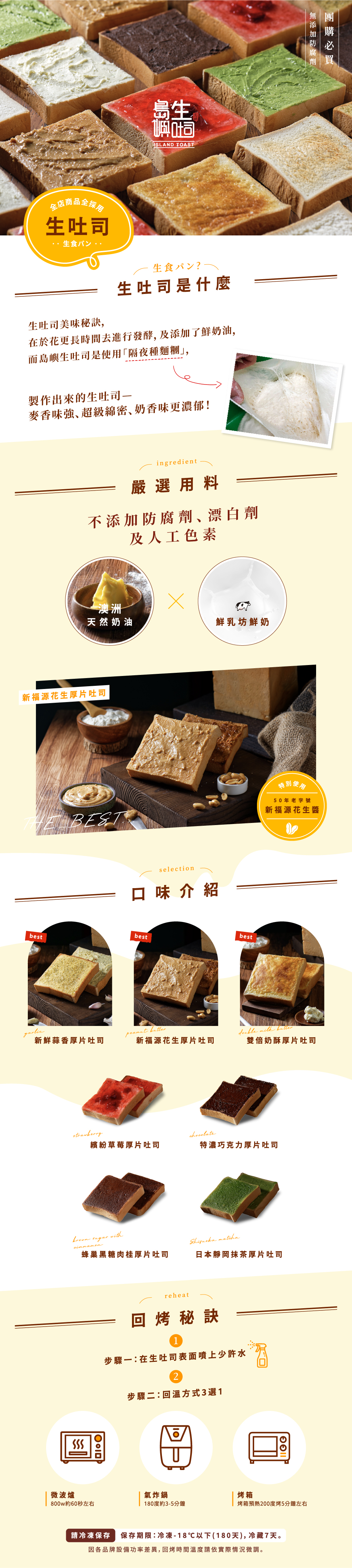 退換貨說明・如欲退貨,您可透過LINE禮物 / 我的 / 我的禮物 / 點擊商品 /「洽詢訂單問題」提出取消要求給供應商。・本商品無法提供換貨服務,如需其他商品請您重新購買 商家資訊公司名:島宇食品有限公司地址:新北市五股區中興路二段37巷11弄14號統一編號:90798837負責人:陳威宇客服電話:02-8285-5625#13信箱:jamie.islandtoast@gmail.com