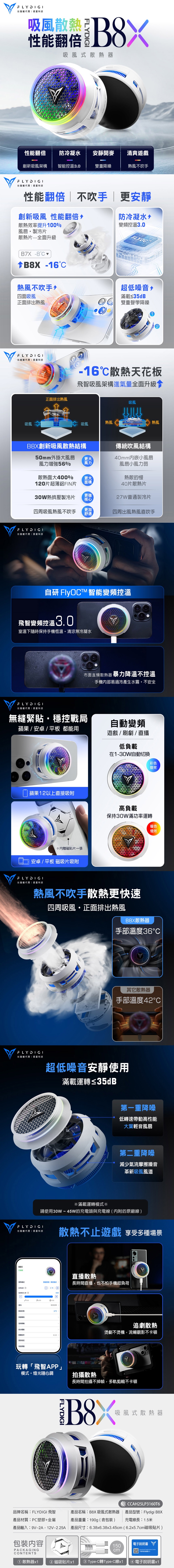 品牌名稱:FLYDIGI 飛智產品名稱:B8X 吸風式散熱器產品型號:Flydigi B8X 產品顏色:白色產品材質:金屬產品尺寸:6.35x3.5cm引磁片尺寸:6.2x5.7cm產品重量:190g(含包裝)產品產地:中國產品內含:散熱器x1、Type-C充電線x1、磁吸貼片x1、電子說明書x1NCC字號:CCAH25LP3160T6