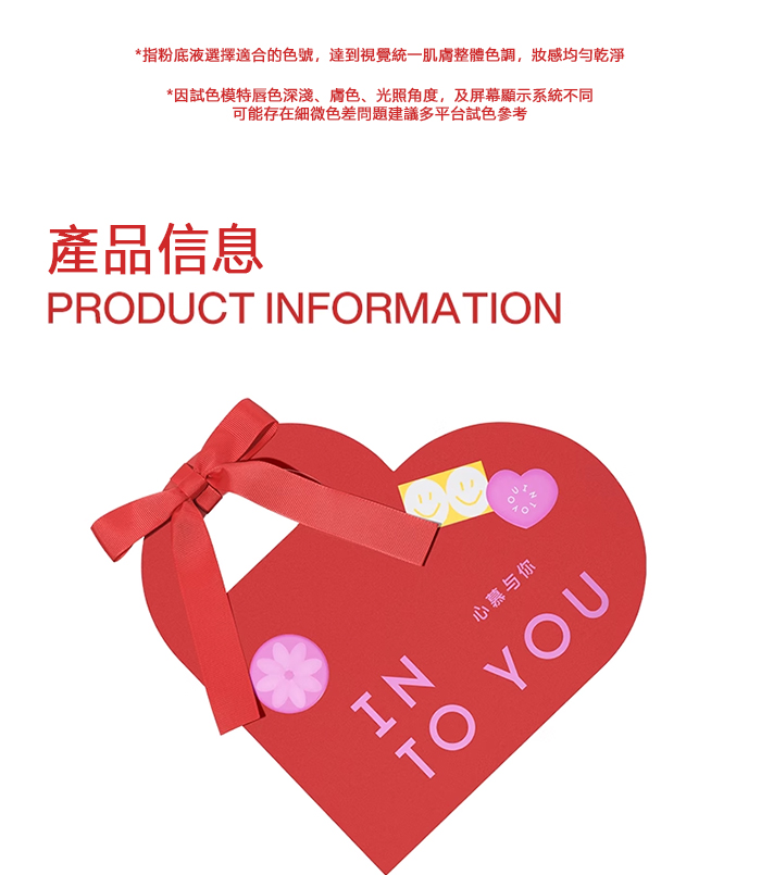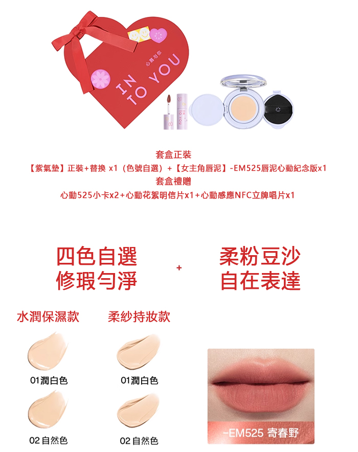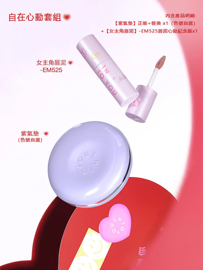 商品內容:品牌名稱:INTO YOU 產品名稱:自在心動套組 內含明細:【紫氣墊】正裝+替換 x1(色號自選)【女主角唇泥】- EM525 唇泥心動紀念版 x1保存期限:3年(詳見實體包裝)儲存方式:常溫密封保存,避免陽光直射------------------------------------------------------快速出貨:🚚週一〜週五1.凌晨00:00~中午12:00下訂,並【完成填收件資訊】,當天出貨2.中午12:01~晚上23:59訂單,需一日工作天寄出🚚假日/例假日• 完成填寫收件資訊後,於隔一工作日出貨• 如超過時間内填寫、資訊不全、變更配送資料,將於隔日工作天出貨