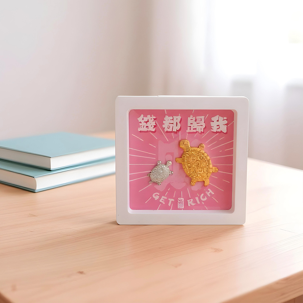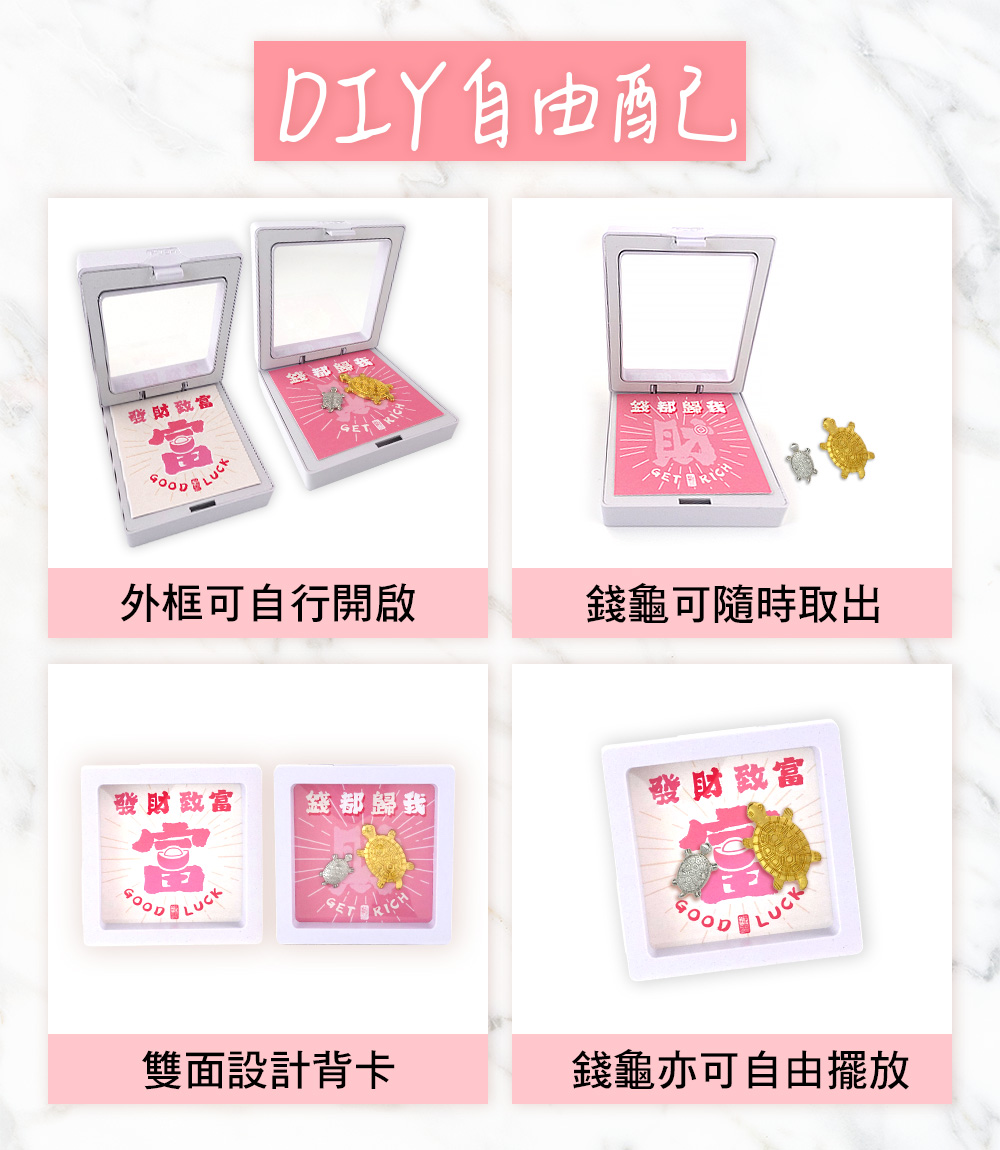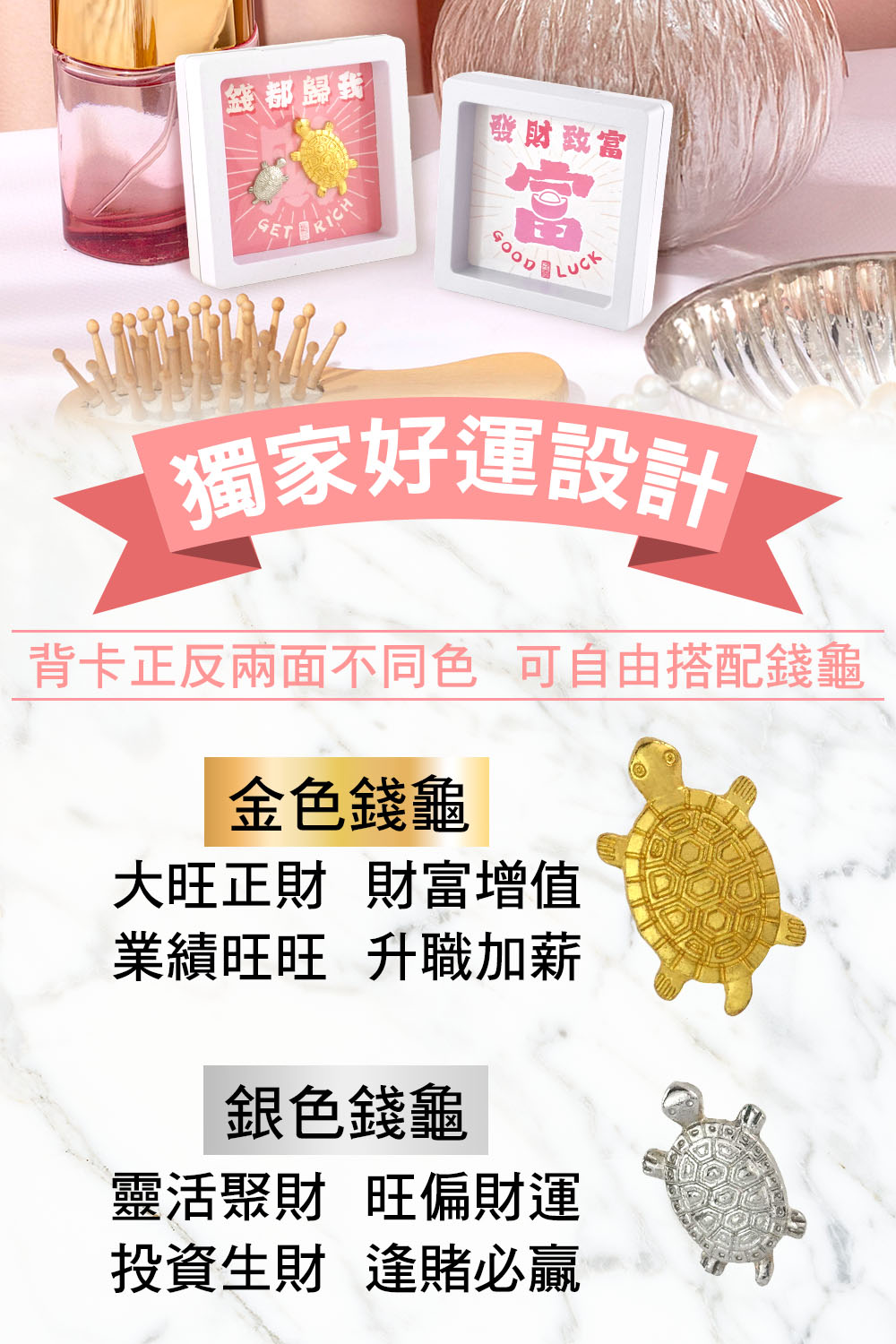「錢都龜我招財鎮」靈感源自古傳四大神獸之一——玄武靈龜,象徵長壽、吉祥與強大守護力。金、銀錢龜成雙成對,代表正財、偏財同步到位,不論你是努力拚業績的上班族,還是想靠投資財富自由的躺賺族,都能藉由這對錢龜招引財氣、財源廣進。「錢龜」的「龜」與「歸」同音,寓意金錢回歸、不再流失,搭配招財納福的能量意象,讓這款小物成為日常生活中的聚財神器。招財鎮外框可自由開啟,讓你靈活搭配錢龜擺放在辦公桌、書桌、玄關等處,小巧可愛、靈氣十足,不只提升空間磁場,也為整體氛圍增添一抹開運巧思。