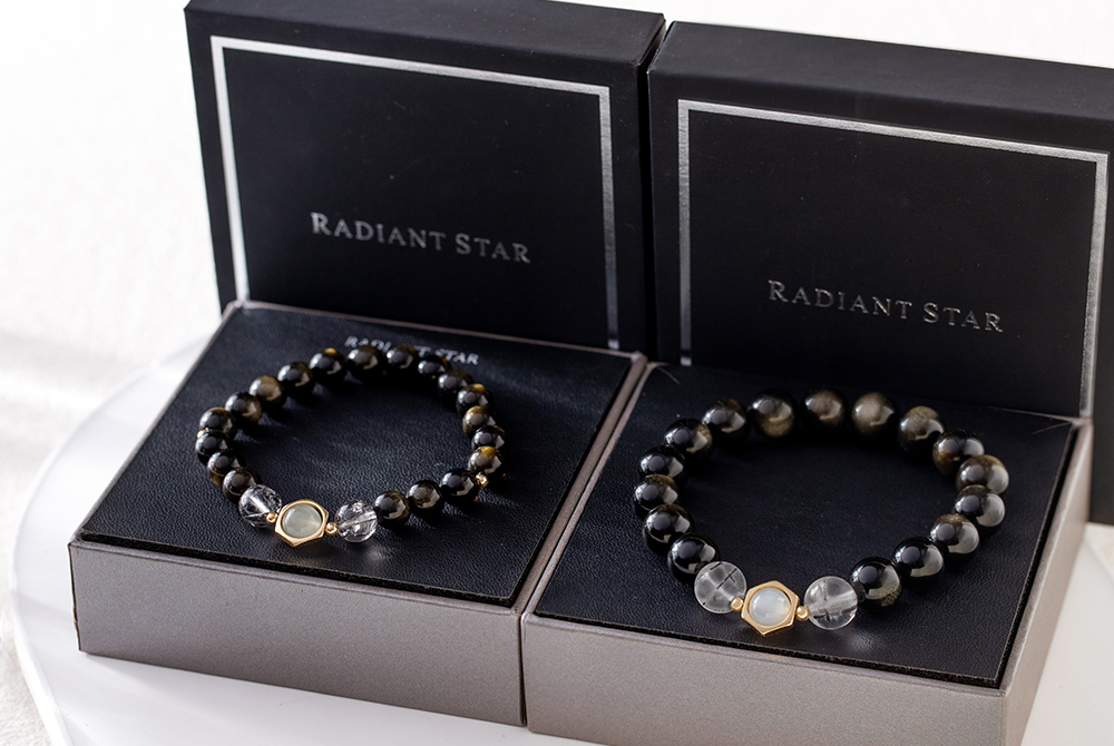 黑髮晶、金曜石與月光石的情侶搭配,守護愛情的同時,增強感情的深度與光彩。黑髮晶增強穩定,金曜石吸引財運,月光石帶來浪漫與直覺讓你們的愛情更加璀璨與和諧