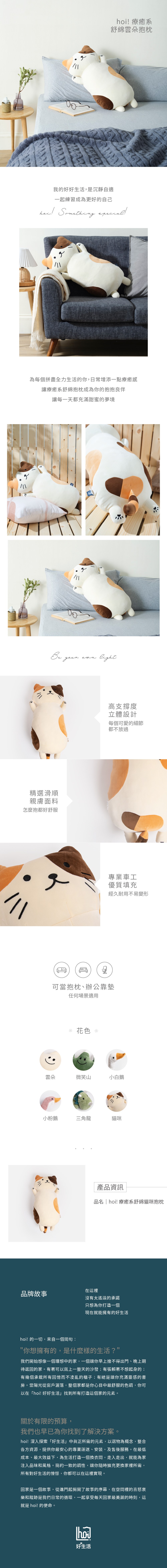 商品特色面料特點:親膚、滑順,柔軟專業車工,優質填充,經久耐用不僅可以當家居擺飾也是最佳的抱抱良伴---------------------------------品名: hoi!療癒系貓咪抱枕---------------------------------