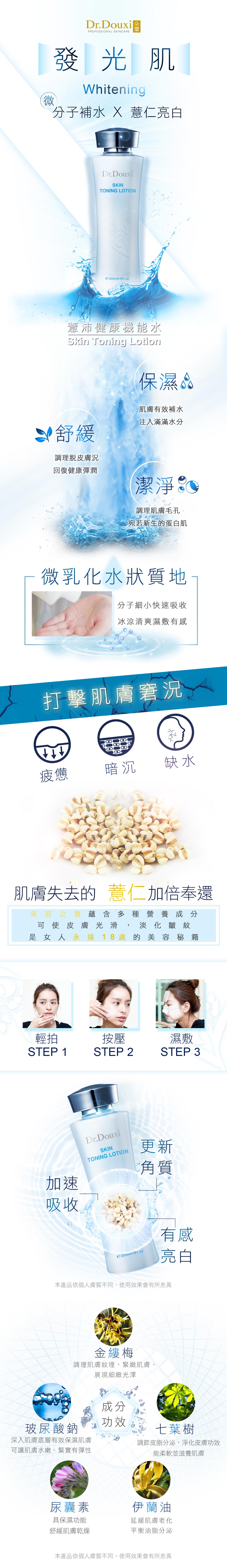 補水,一擦二拍三濕敷,輕鬆調理肌膚狀況,小分子滲透補足肌底水分,更添加多種植物萃取調理肌膚紋理。