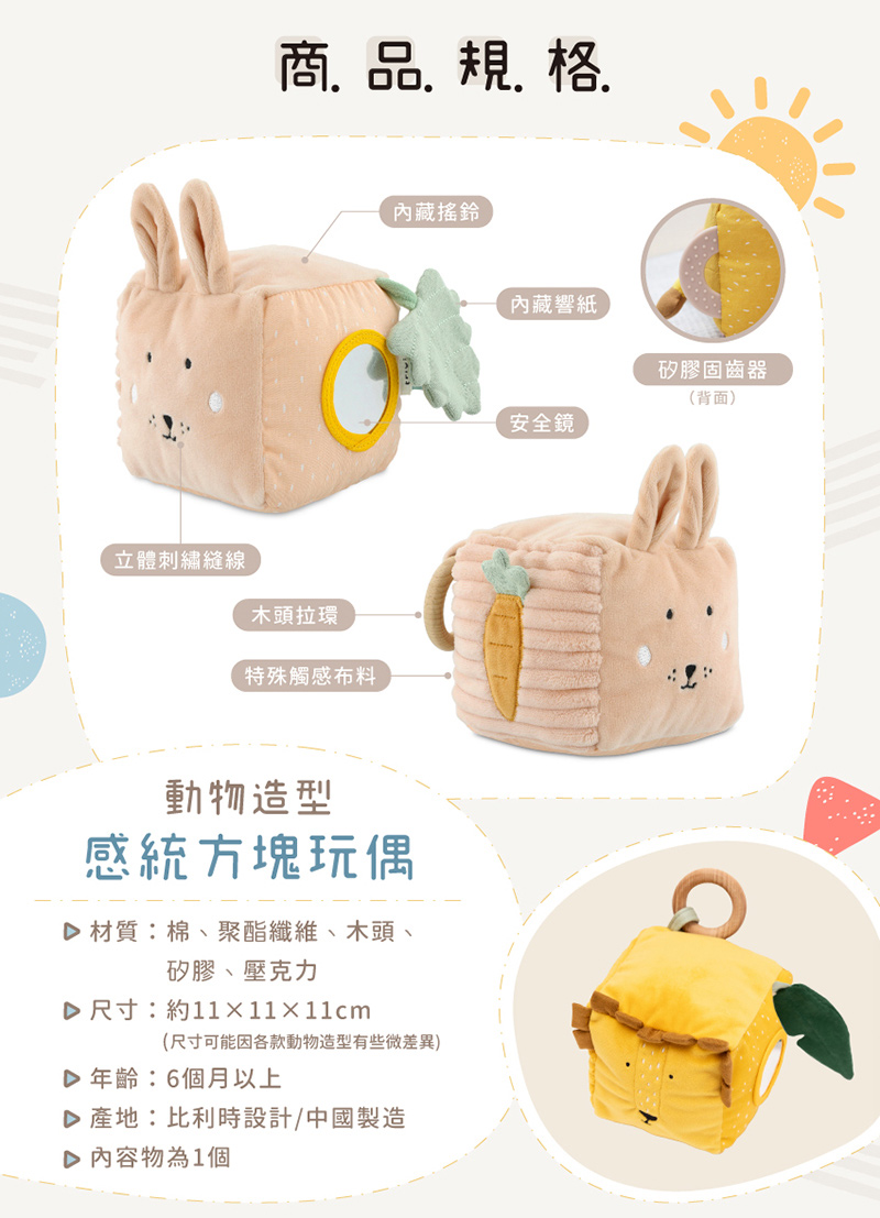 商品介紹商品內容名稱:比利時Trixie 動物造型感統方塊玩偶功能:寶寶感統|穩定情緒好幫手尺寸:11x11x11 公分 配送辦法完成付款後會儘速使用本公司配合的黑貓物流寄出,出貨時間三日工作天(不含例假日)。