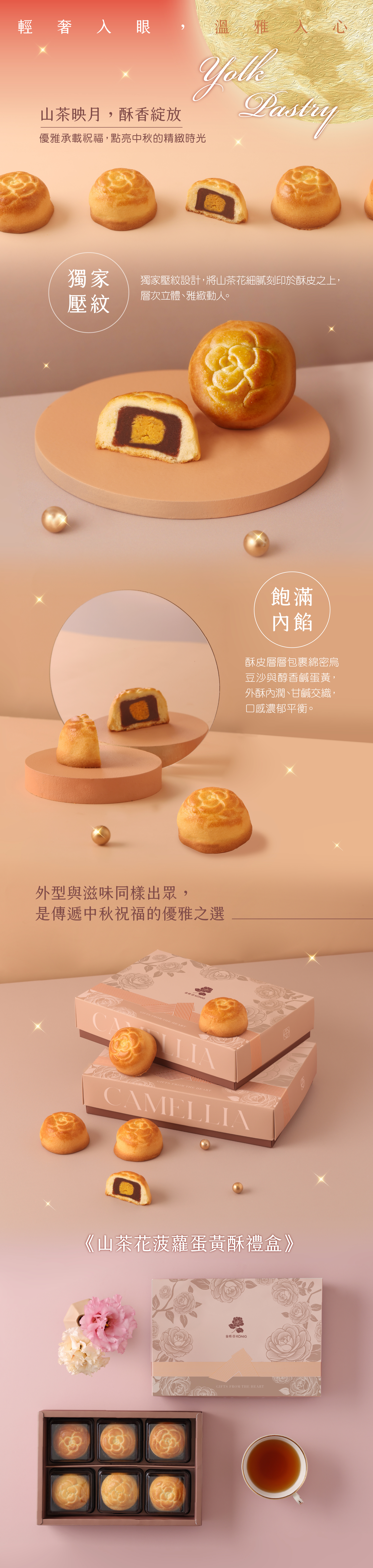 山茶花菠蘿蛋黃酥,酥皮輕薄如瓣,包裹綿密烏豆沙與醇香鹹蛋黃,