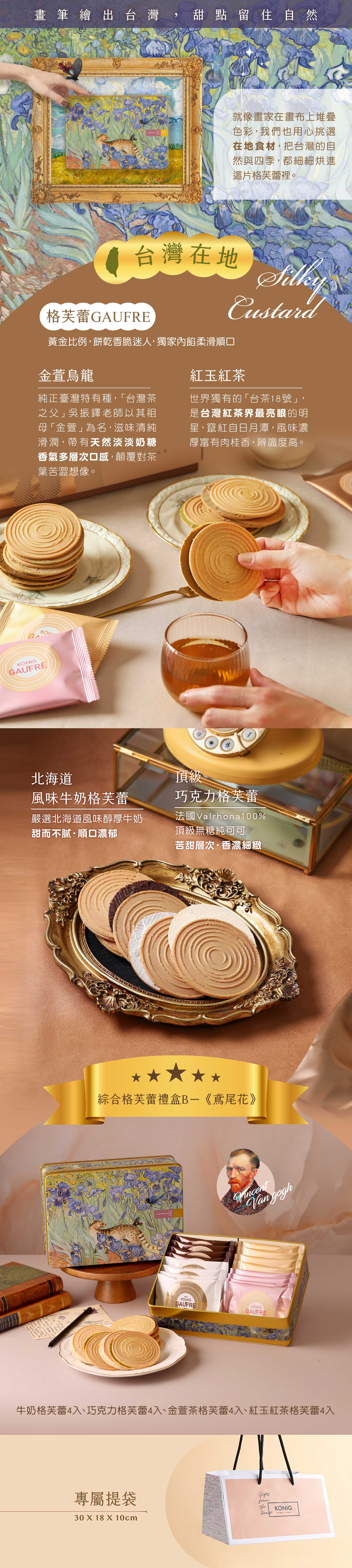 • 綜合格芙蕾禮盒-鳶尾花商品內容:巧克力風味格芙蕾4入、牛奶格芙蕾4入、金萱茶格芙蕾4入、紅玉紅茶格芙蕾4入