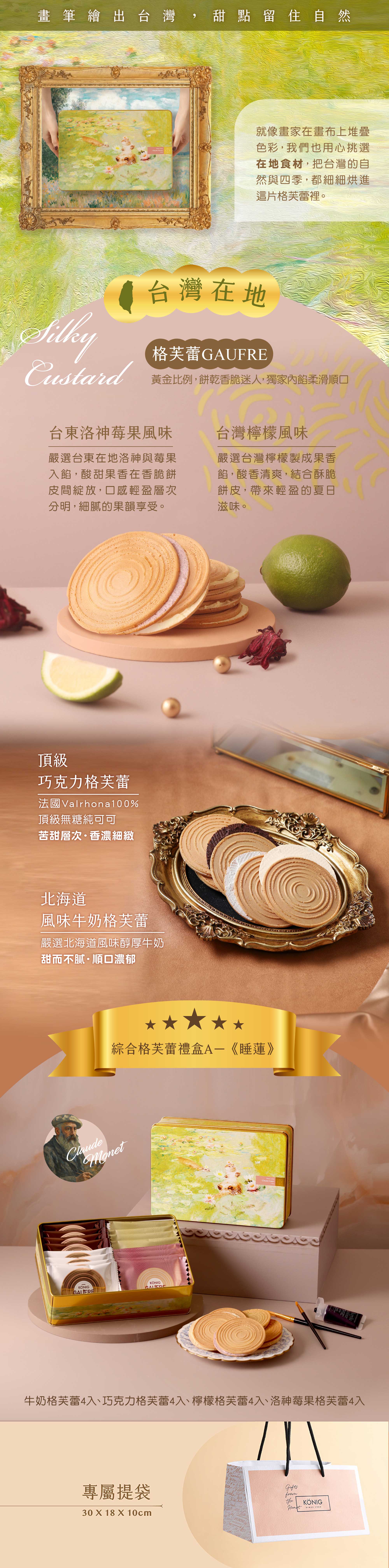 商品內容:巧克力風味格芙蕾4入、牛奶格芙蕾4入、洛神莓果格芙蕾4入、檸檬格芙蕾4入