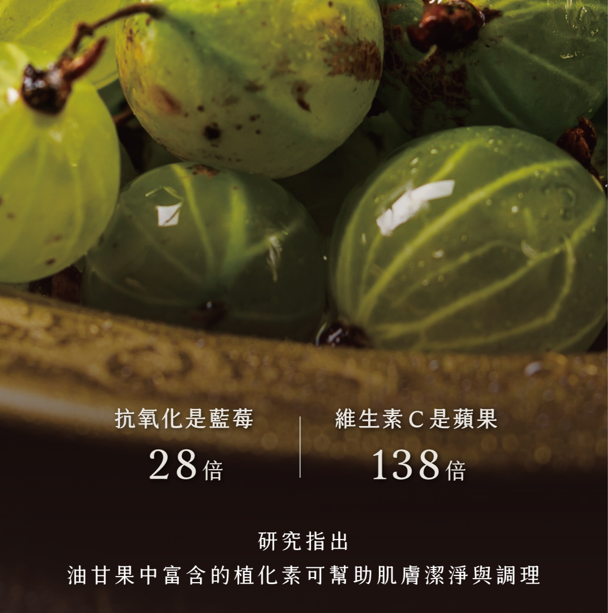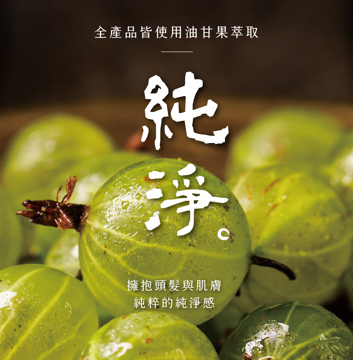 ‧ 萃取天然油甘果植物|本身的高含量維生素C和維生素E,具抗氧化性,可淨化肌膚,同時擁有植物多酚及黃酮類成分,能清潔抗污,有效洗淨。