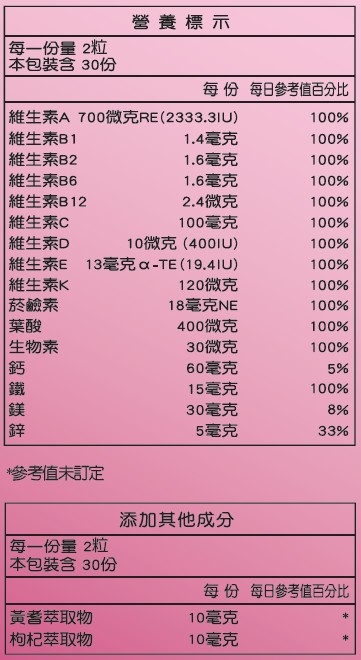 商品成分:麥芽糊精,紅藻粉(海藻鈣),微結晶狀α-纖維素,維生素C(L-抗壞血酸),焦磷酸鐵,海水抽出物(氧化鎂,羧甲基纖維素鈉),葡萄糖酸鋅,維生素E(乙酸dl-α-生育醇脂)(乙酸dl-α-生育醇酯,乾燥葡萄糖漿,辛烯基丁二酸鈉澱粉,二氧化矽),二氧化矽,維生素B3(菸鹼酸),黃耆萃取物(黃耆萃取物,麥芽糊精),枸杞萃取物(枸杞萃取物,麥芽糊精),硬脂酸鎂,維生素A(維生素A乙酸酯)(乾燥葡萄糖漿、阿拉伯膠,玉米澱粉,維生素A乙酸酯,維生素E(抗氧化劑)),維生素D3(膽鈣化醇)(麥芽糊精,阿拉伯膠,中鏈三酸甘油酯,抗壞血酸(抗氧化劑),膽鈣化醇(維生素D3),生育醇(維生素E)(抗氧化劑)),維生素B12(氰鈷胺明)(麥芽糊精,檸檬酸鈉,檸檬酸,維生素B12(氰鈷胺明)),維生素K1(阿拉伯膠,維生素K1,蔗糖),維生素B6(鹽酸吡哆辛),維生素B1(鹽酸硫胺明),維生素B2(核黃素),維生素B9(葉酸),維生素B7(生物素)(膠囊殼:羥丙基甲基纖維素,純水,鹿角菜膠,氯化鉀)。