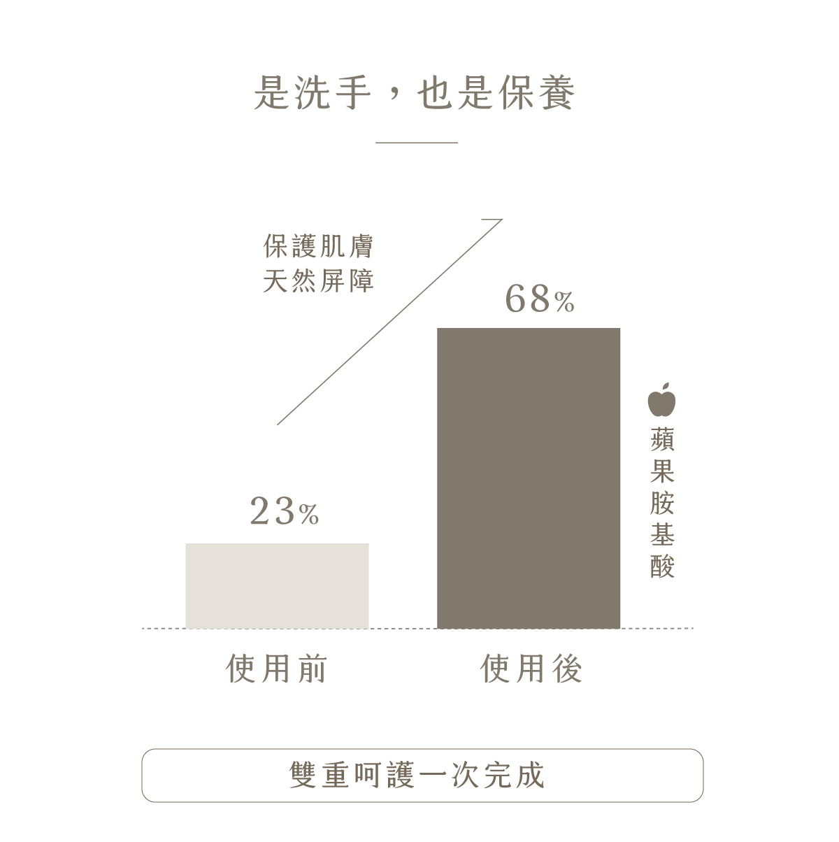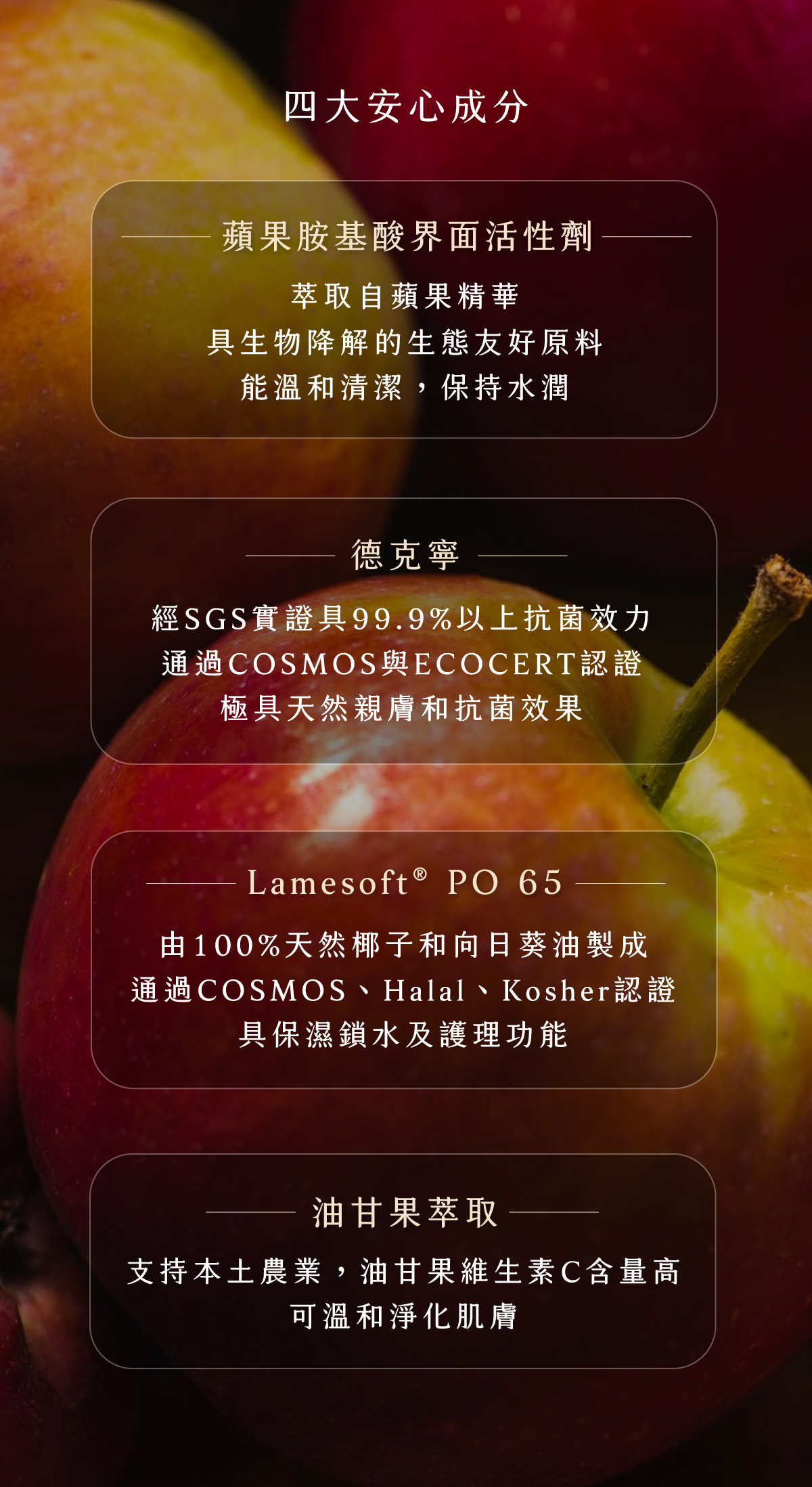 ‧ 使用蘋果胺基酸界面活性劑|溫和清潔,不含石化界面劑。保濕效果優於一般胺基酸,更適合長期使用。