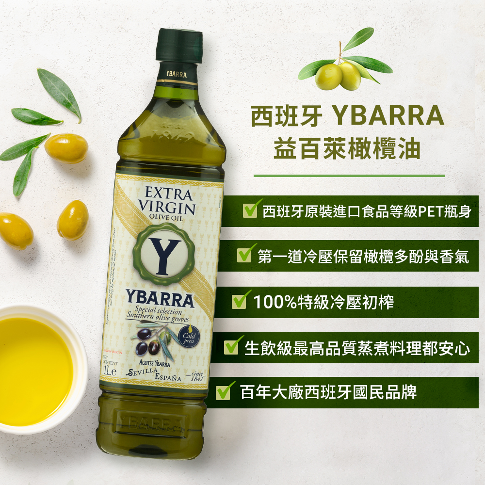 來自西班牙 YBARRA 益百萊的特級冷壓初榨橄欖油1000ml容量,適合日常烹飪與中高溫料理,可直接食用、涼拌、沙拉、煎、炒、煮、蒸都合適也是煮飯做菜的首選好幫手。
