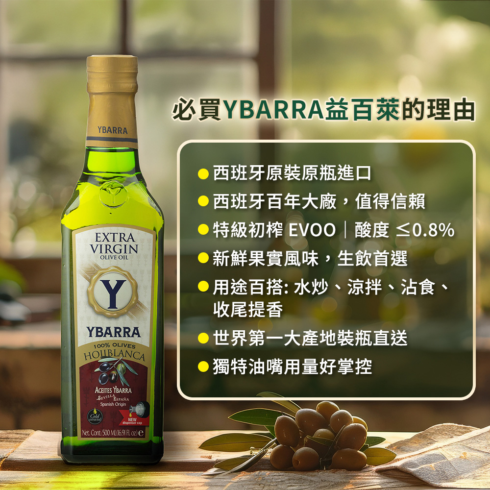 來自西班牙 YBARRA 益百萊的特級初榨橄欖油 單一品種HOJIBLANCA 500ml容量,適合日常烹飪與中高溫料理,可直接食用、涼拌、沙拉、煎、炒、煮、蒸都合適也是煮飯做菜的首選好幫手。