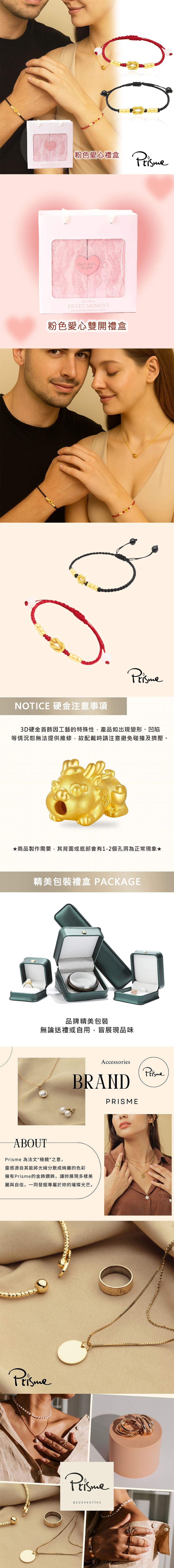 ◆商品內容品牌 Prisme Gold材質說明 墜飾:9999純金|手鍊:繩編織重量 黃金金重:約0.08錢±0.03錢商品包裝配件 手環、保證書、飾品盒、愛心雙開禮盒