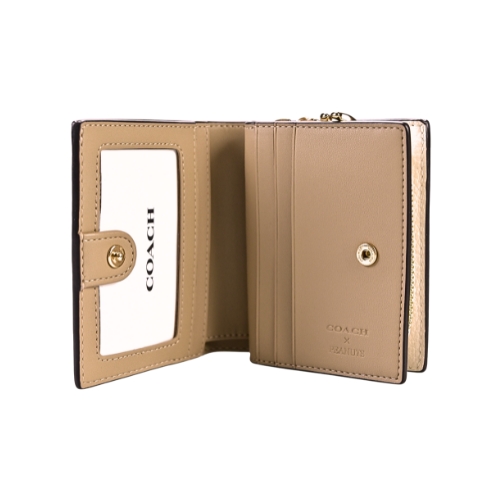 COACHX PEANUTS聯名新款實用短夾,經典C Logo PVC輔以史努比漫畫人物圖印,增添童趣魅力, 搭配內素面真皮,釦式雙摺開合使用便利,內裡格置卡片格、透明證件夾與鈔票夾,外部拉鍊零錢袋,尺寸便攜。★尺寸:寬10.5CM高9CM側邊厚2.5CM ★規格:釦式雙摺開合,內設單格鈔票夾/3格卡片夾/2格萬用夾/單格透明證件夾,外部背面一拉鍊零錢袋