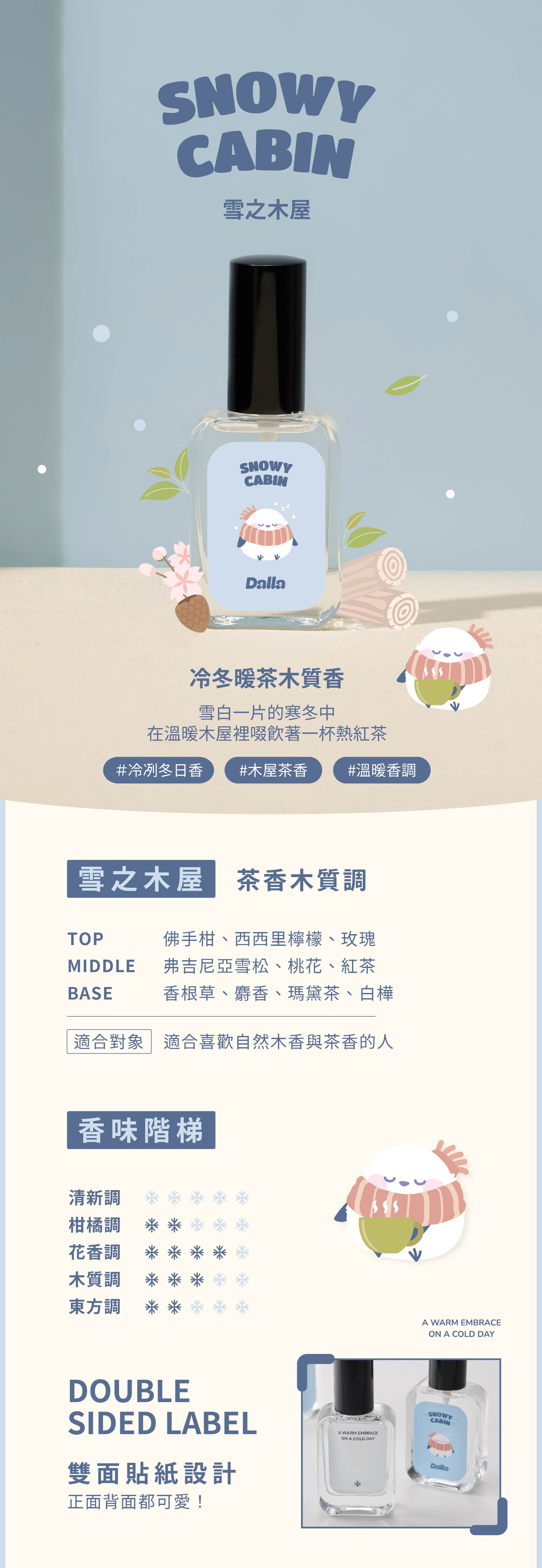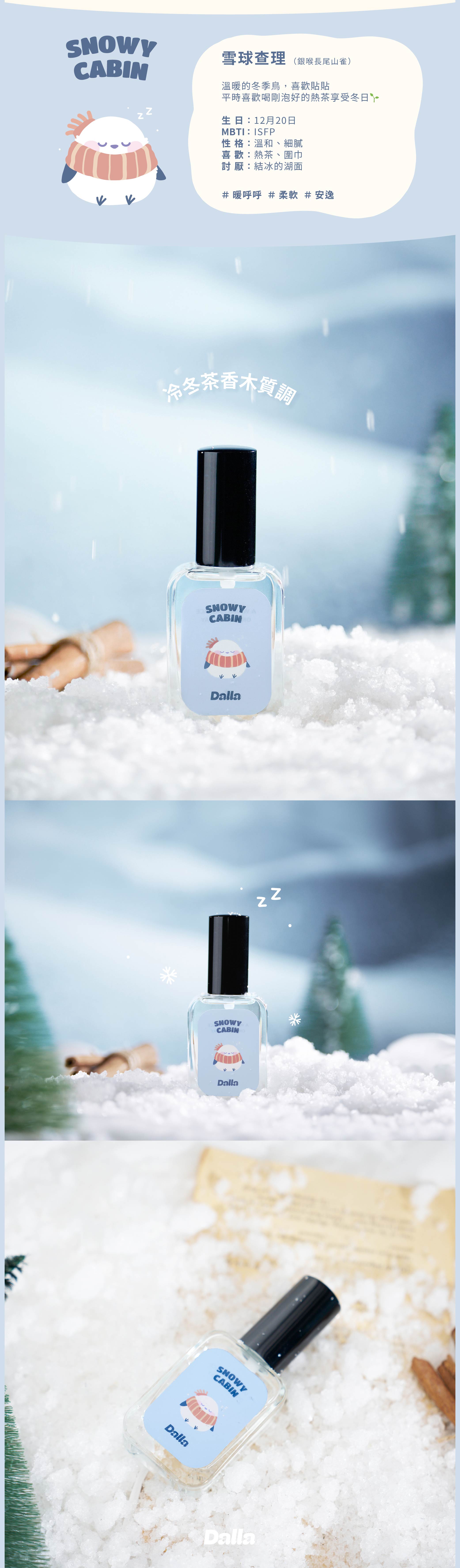 ◆商品內容名稱:【Dalla】雪之木屋|Snowy Cabin 淡香水 35ml香調:❄️ 冷冬暖茶木質調|木質調