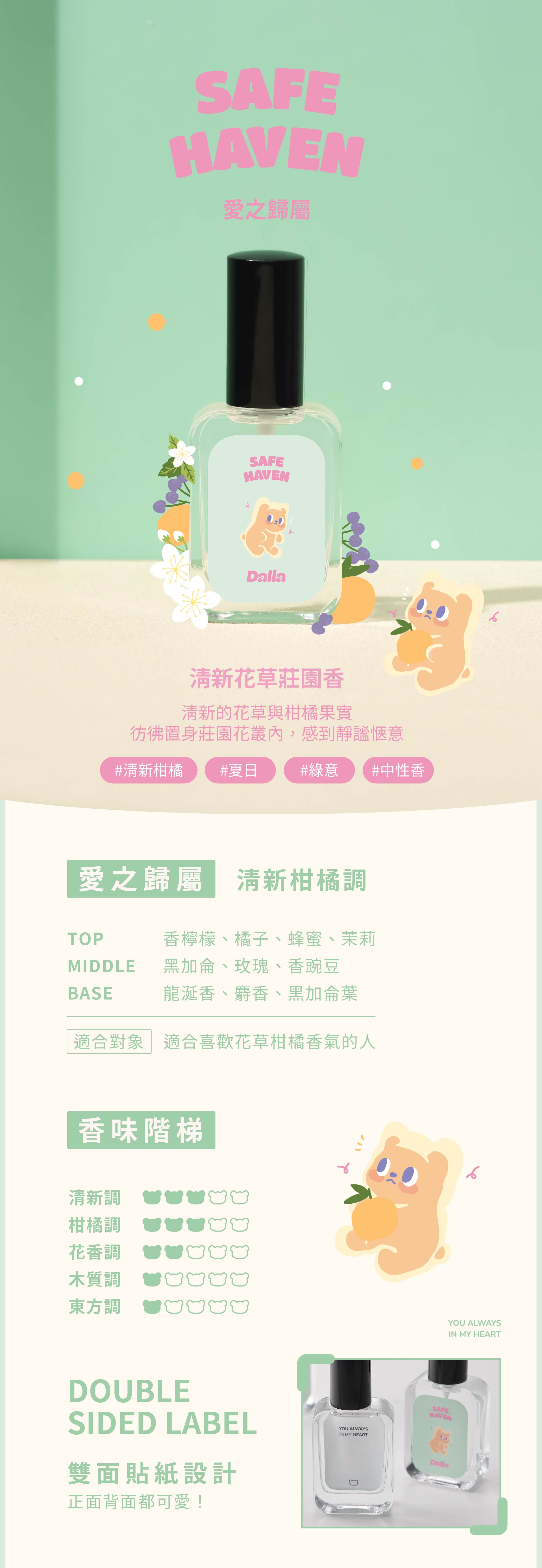 材質:玻璃、液體功能:噴拭於耳後、頸部、手腕等部位,增添香氣、創造美好心情。容量:35ml±10%