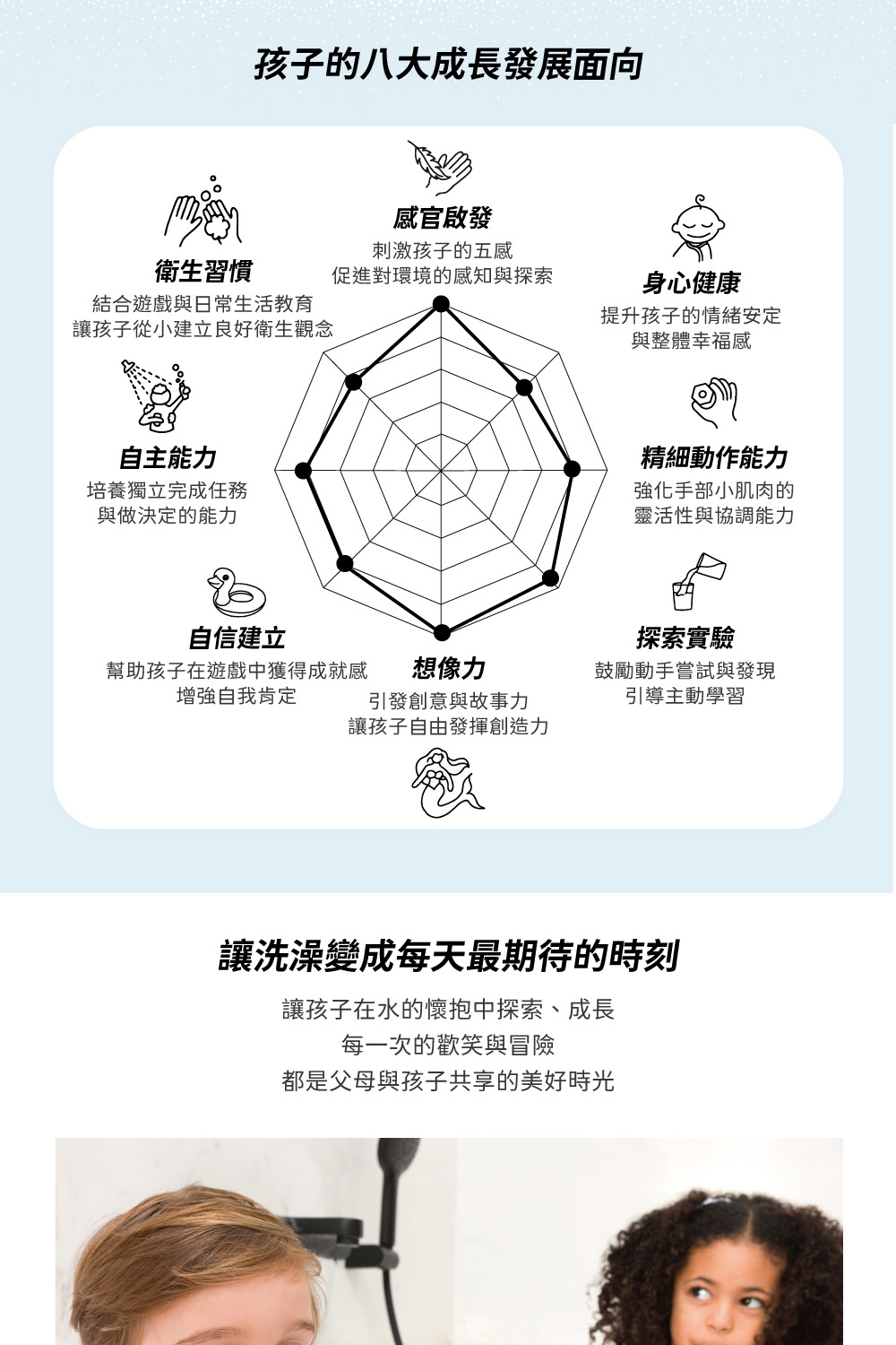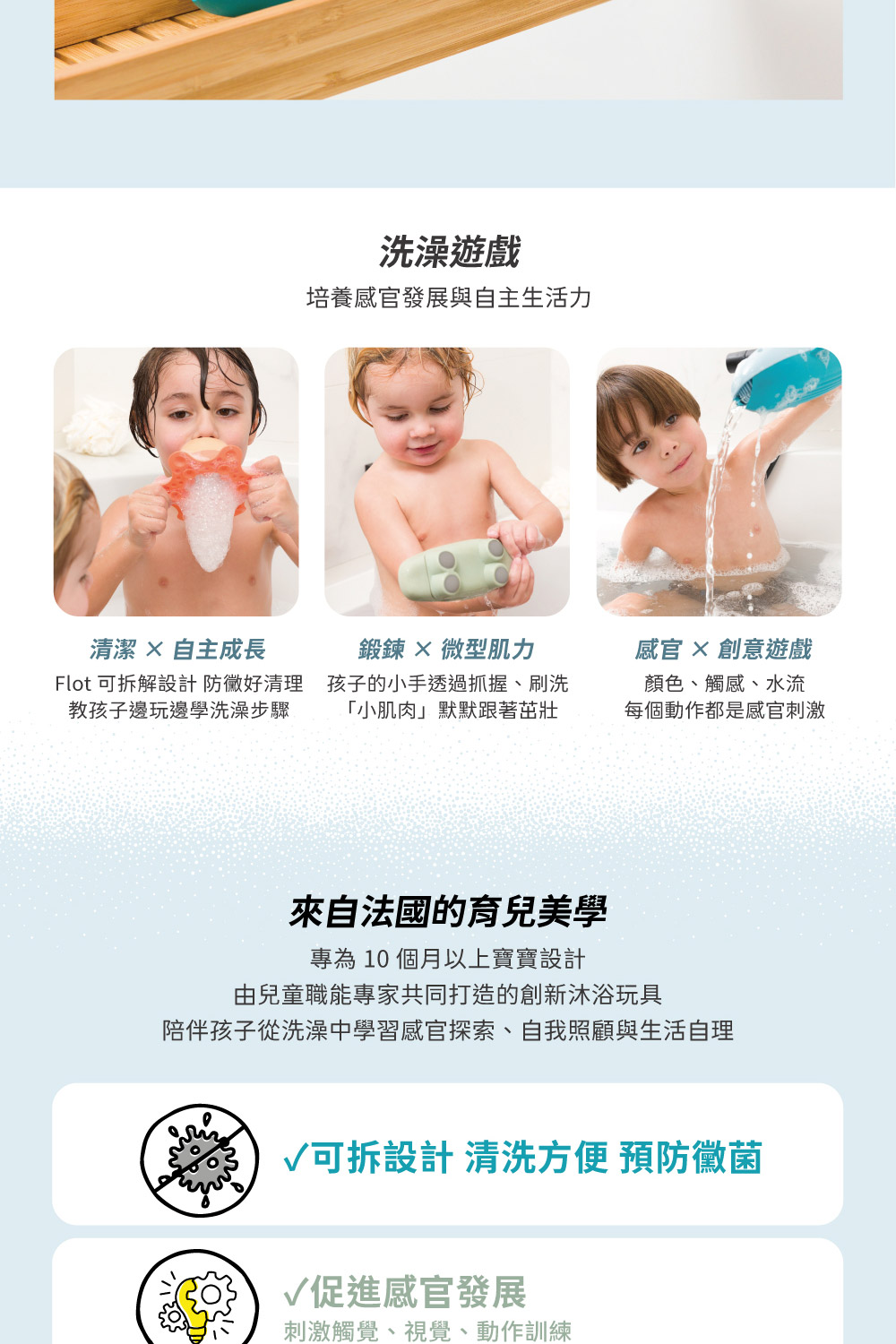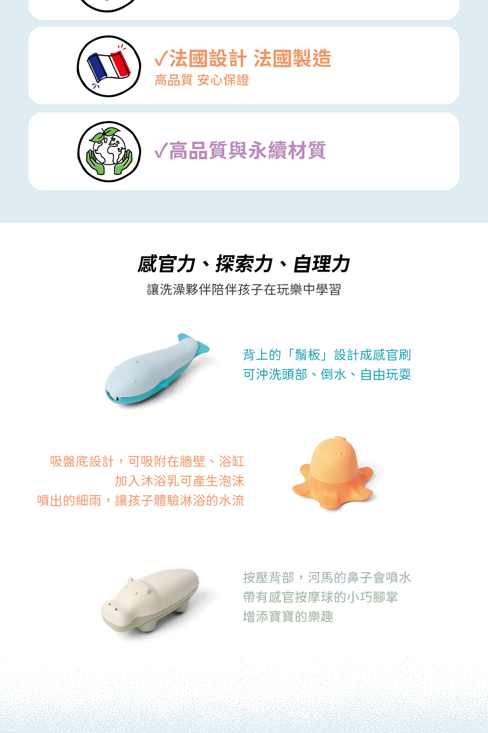 河馬是寶寶放鬆洗澡的最佳好夥伴。正如所有河馬一樣,洗澡時的放鬆非常重要,這份輕鬆的氛圍也會透過河馬傳遞給孩子!配備了帶有感官按摩球的小巧腳掌,讓孩子在洗澡時甚至洗完澡後,都能和它一起玩耍,享受專為兒童設計的小按摩時刻。無論是認識身體部位、感官觸覺啟蒙,還是看著水從河馬鼻孔中噴出的趣味瞬間,都是陪伴寶寶進入愉快且富有教育意義洗澡時間的好朋友。