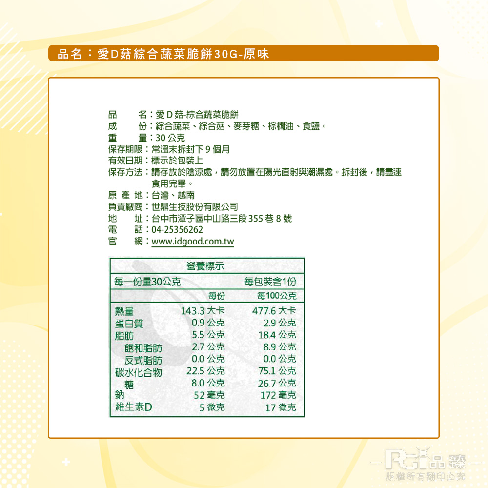 1.商品組合/規格:【愛D菇】綜合蔬菜脆餅(30g)-原味2.商品品名:【愛D菇】綜合蔬菜脆餅(30g)-原味3.成分:綜合蔬菜、綜合菇、麥芽糖、棕櫚油、食鹽。4.商品重(容)量:30g/包5.原產地(國):台灣、越南6.保存期限:常溫未拆封 9個月(實際依商品包裝標示)7.製造廠商或國內負責廠商名稱:品臻國際行銷有限公司8.製造廠商或國內負責廠商地址:台北市中山區民生東路一段43號7樓9.製造廠商或國內負責廠商電話:02-8861-520810.食品業者登錄字號:A-127757268-00001-311.投保產品責任險字號:富邦產物0510字第25AML0000316號