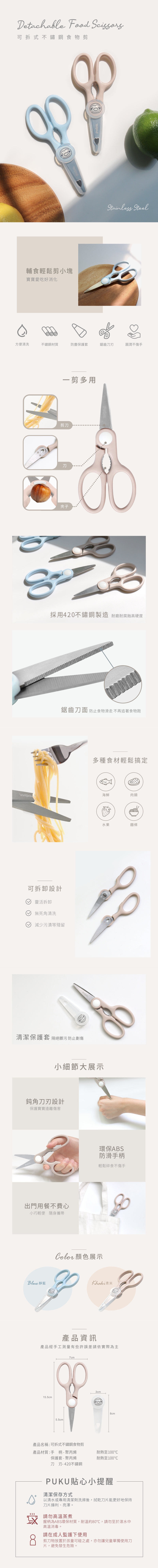 不鏽鋼食物剪:刀刃-420不鏽鋼。手柄/保護刀套/收納盒/安全開關鎖-PP