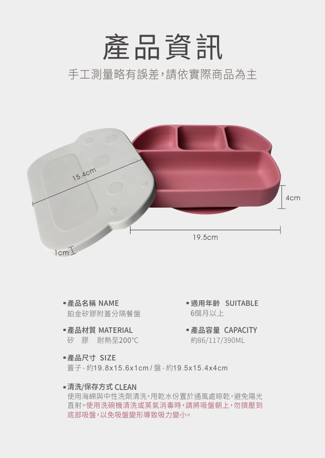 矽膠吸盤餐盤:蓋子-19.8*15.6*1cm/盤-19.5*15.4*4cm/吸盤直徑-15.2cm