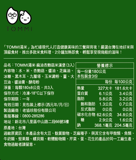 6.過敏原資訊本產品含大豆、麩質、榖物類,與其它含有魚、甲殼類(蝦類)、螺貝類、軟體動物類、堅果、蛋、牛奶、芹菜、芝麻種子的產品於同一工廠生產,食物過敏者請留意
