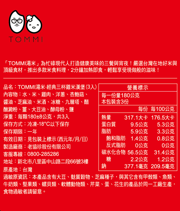 保存方式 : 冷凍商品重(容)量:每顆165-180公克(如商品外包裝標示)內容物成分:如包裝標示食品添加物名稱:無原產地(國):台灣製造廠商或國內負責廠商名稱:老協珍股份有限公司製造廠商或國內負責廠商地址:新北市八里區中山路二段66號製造廠商或國內負責廠商電話:0800285286食品業者登錄字號:A-129035400-00000-1投保產品責任險字號:南山產險3370萬(保險單號0900-2236007163-12)