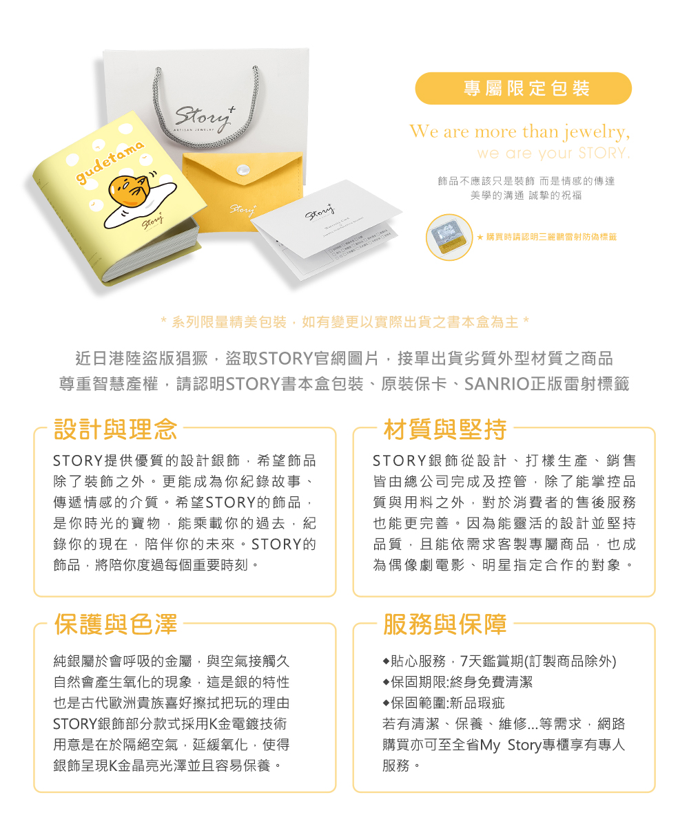 ◆材質 : 925純銀,精鍍18K金,2mm圓型晶鑽◆顏色 : 白K金;黃K金◆尺寸 : 蛋殼7.6x6mm;蛋黃哥8x6.8mm◆其他 : 15公分銀鍊+2.5公分延長鍊◆包裝 : 蛋黃哥精裝書本盒+絨布袋+紙袋+雷射防偽貼紙+商品保固卡
