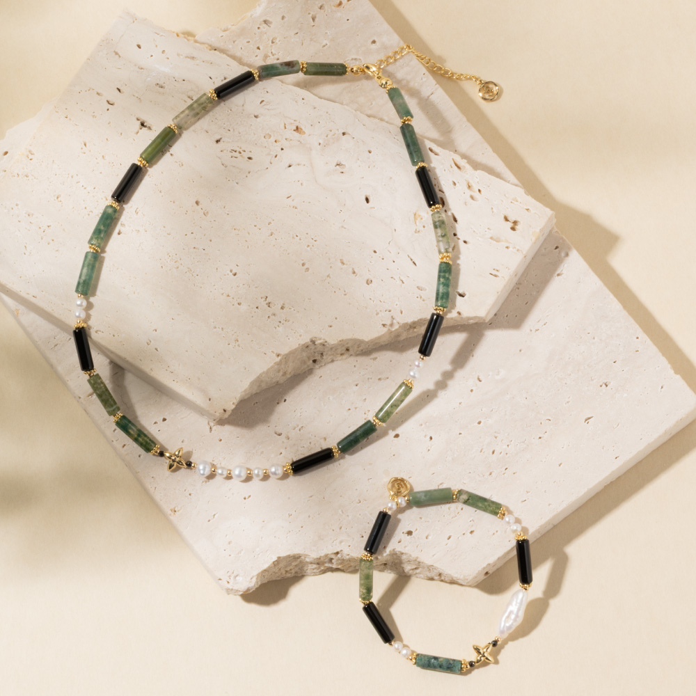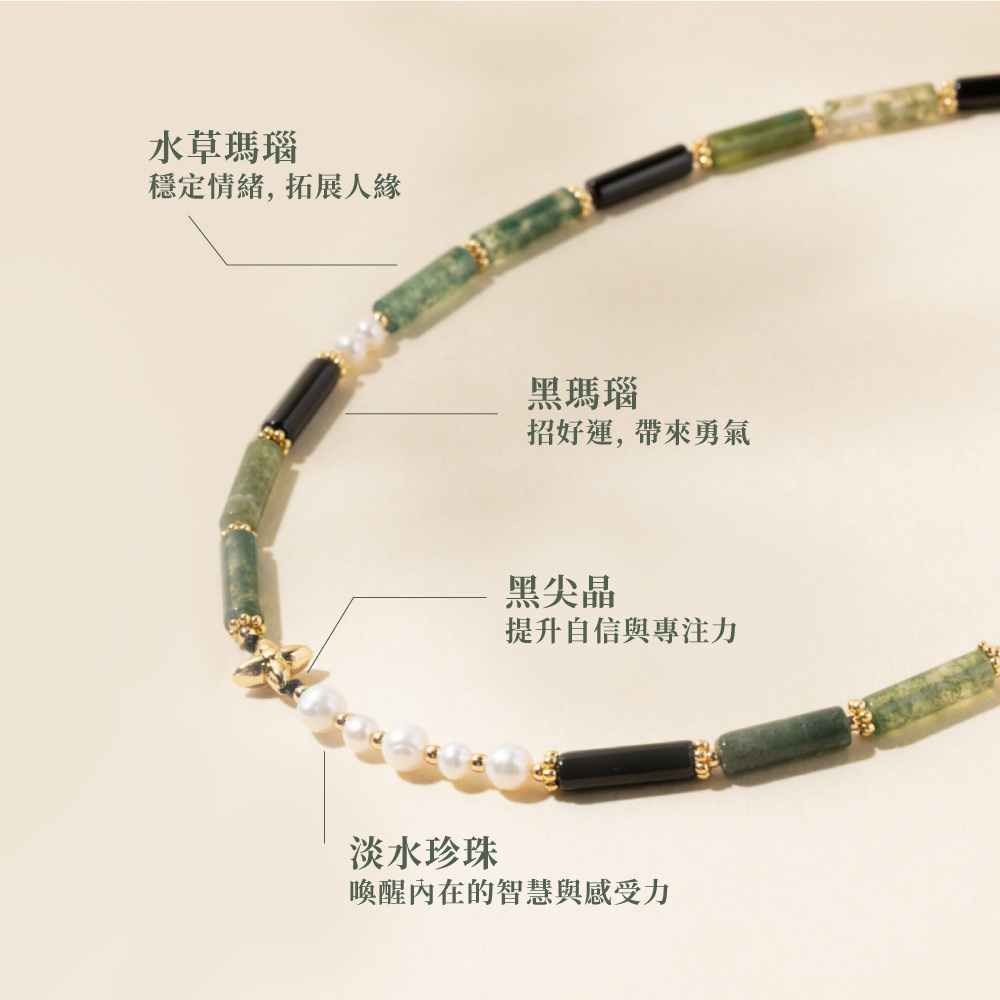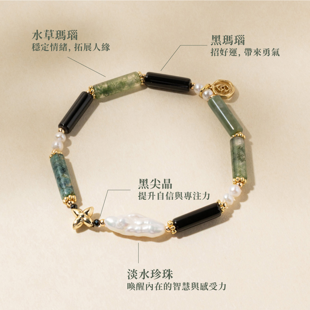 ◦ 水草瑪瑙 | 舒緩壓力, 提升行動力, 拓展人緣◦ 黑瑪瑙 | 辟邪招好運, 清除負能量◦ 黑尖晶 | 自信, 護身符, 消除負能量◦ 淡水珍珠 | 圓滿, 思緒清晰, 撫平焦躁