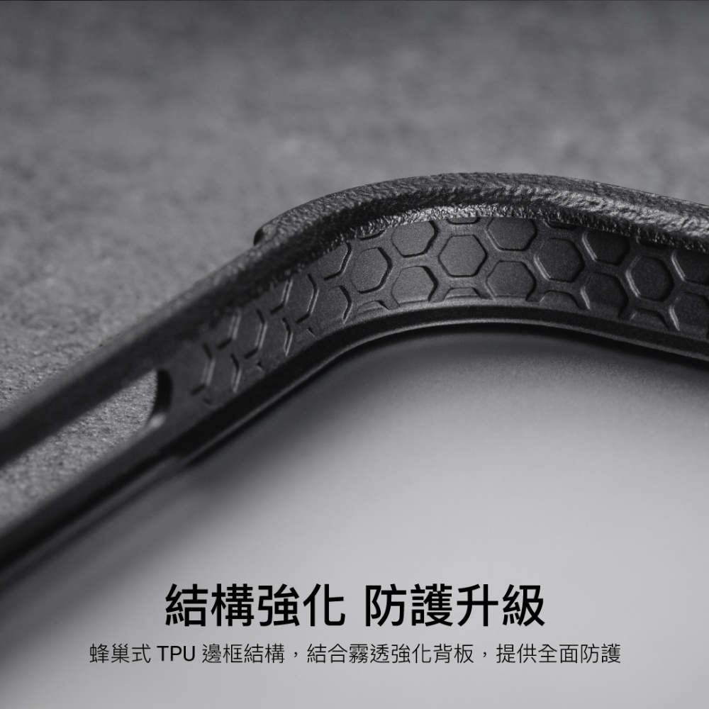 霧透強化背板、蜂巢式軟邊框結構,提供雙層保護