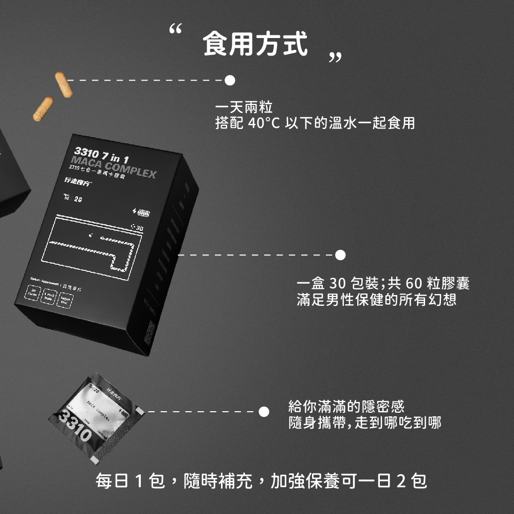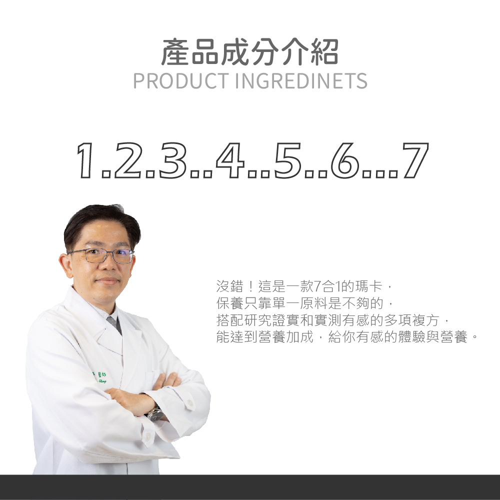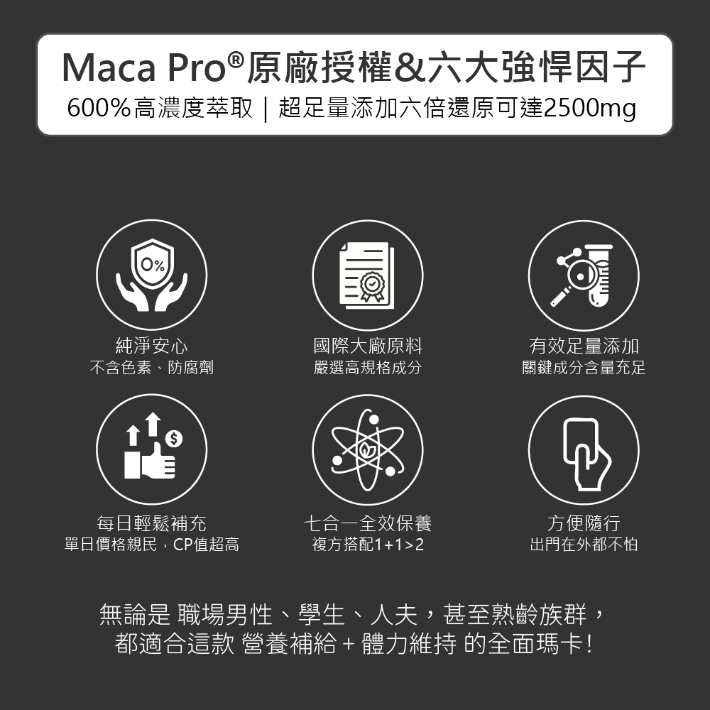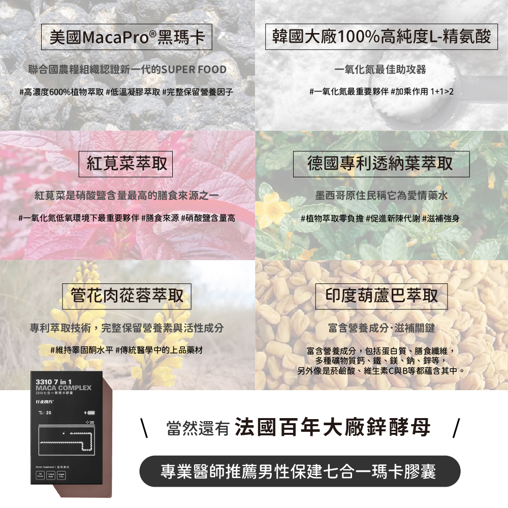 成 分:祕魯黑紅馬卡萃取物、精胺酸、葫蘆巴萃取物(葫蘆巴萃取物、麥芽糊精)、鋅酵母、專利透納樹(葉)萃取物(透納樹(葉)萃取物、阿拉伯膠、二氧化矽)、紅莧菜萃取物、專利管花肉蓯蓉萃取粉(管花肉蓯蓉、麥芽糊精)