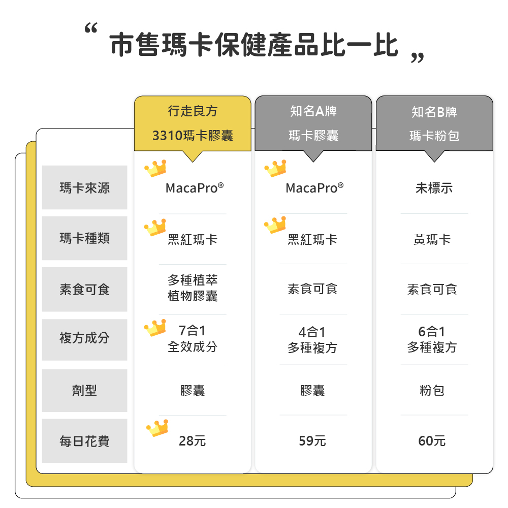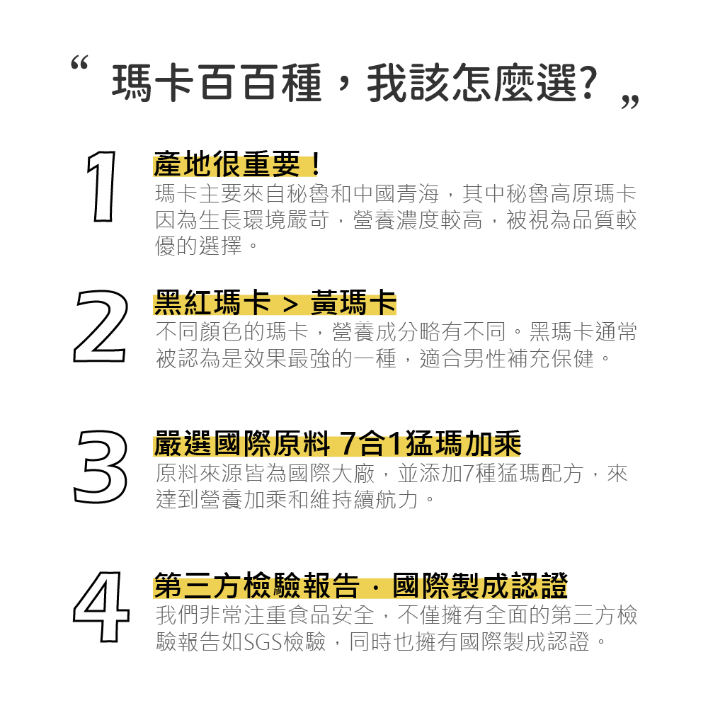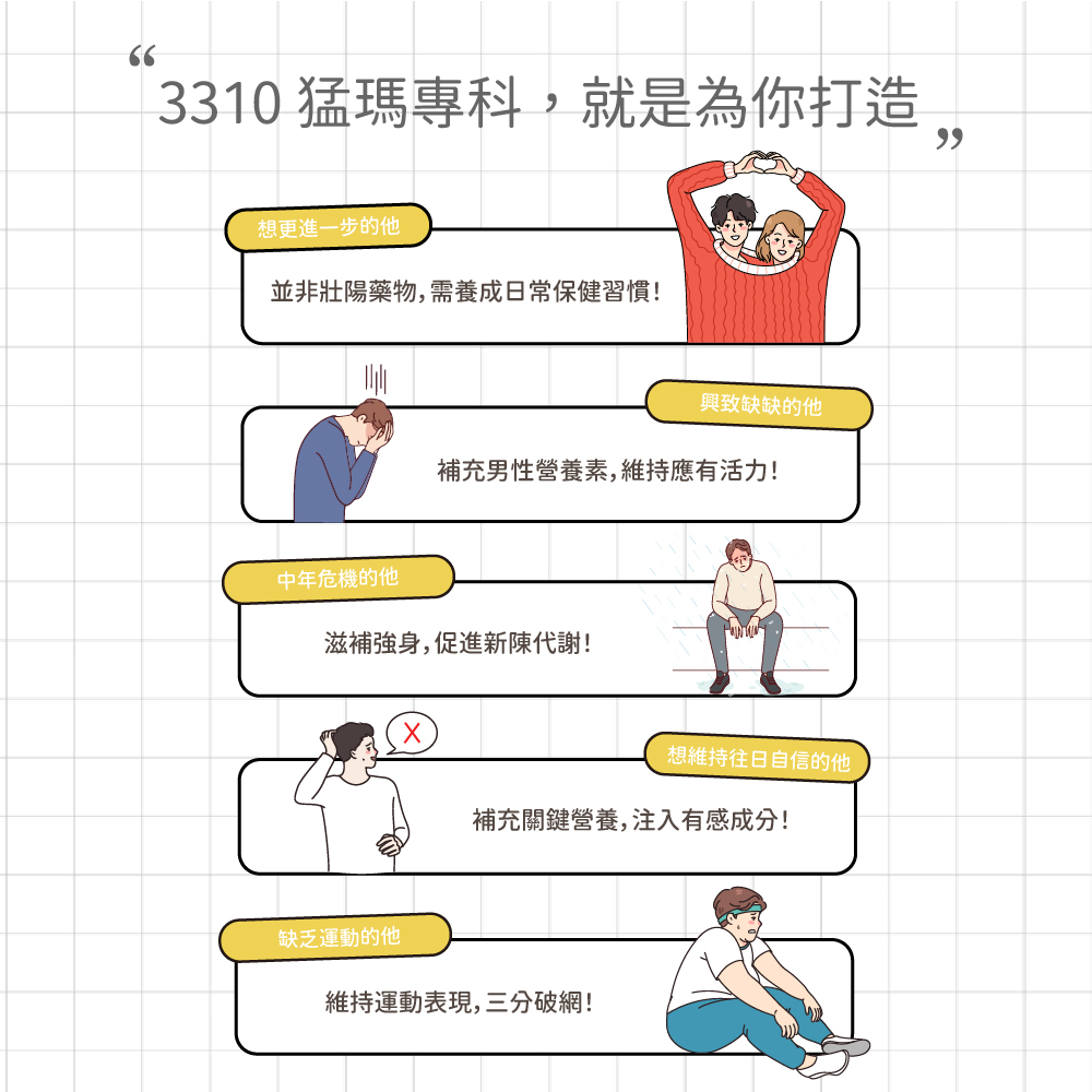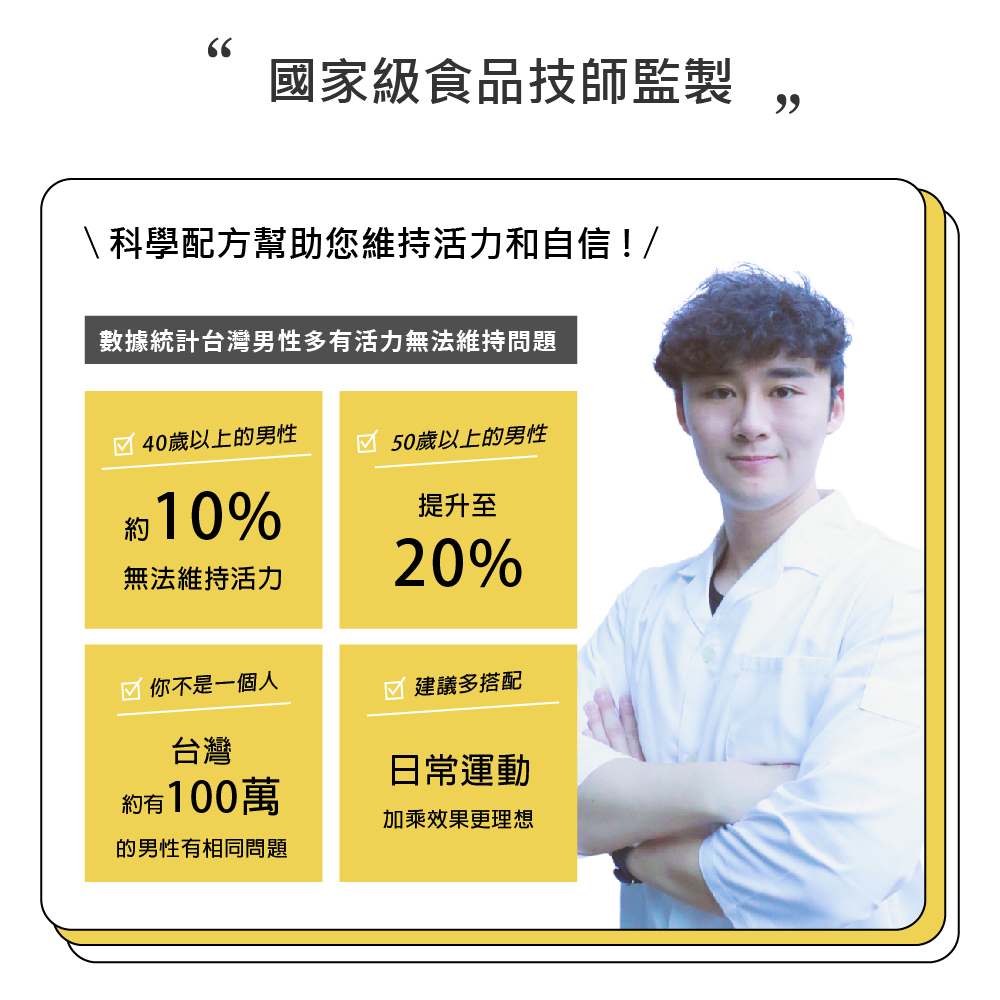成 分:祕魯黑紅馬卡萃取物、精胺酸、葫蘆巴萃取物(葫蘆巴萃取物、麥芽糊精)、鋅酵母、專利透納樹(葉)萃取物(透納樹(葉)萃取物、阿拉伯膠、二氧化矽)、紅莧菜萃取物、專利管花肉蓯蓉萃取粉(管花肉蓯蓉、麥芽糊精)